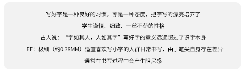 简约经典设计,书写流畅不断墨,练字办公用都不错!轻盈时尚,久握不累,书写流畅、练字书写,韧性好,不刮纸,不断墨,笔记纤细适合长期书写!