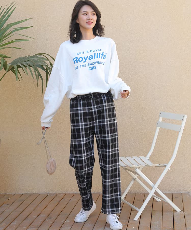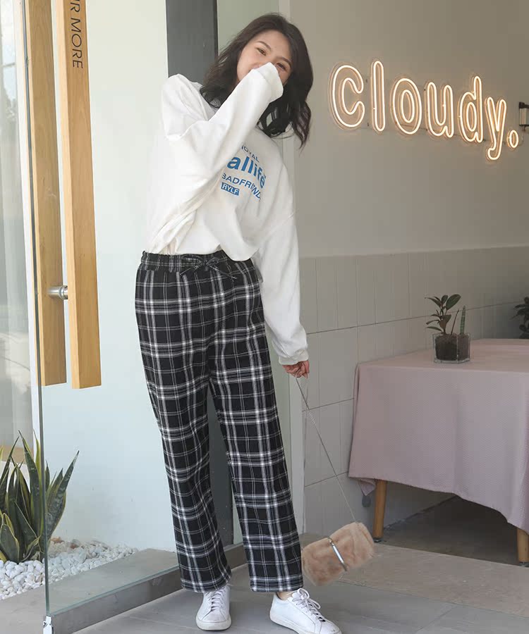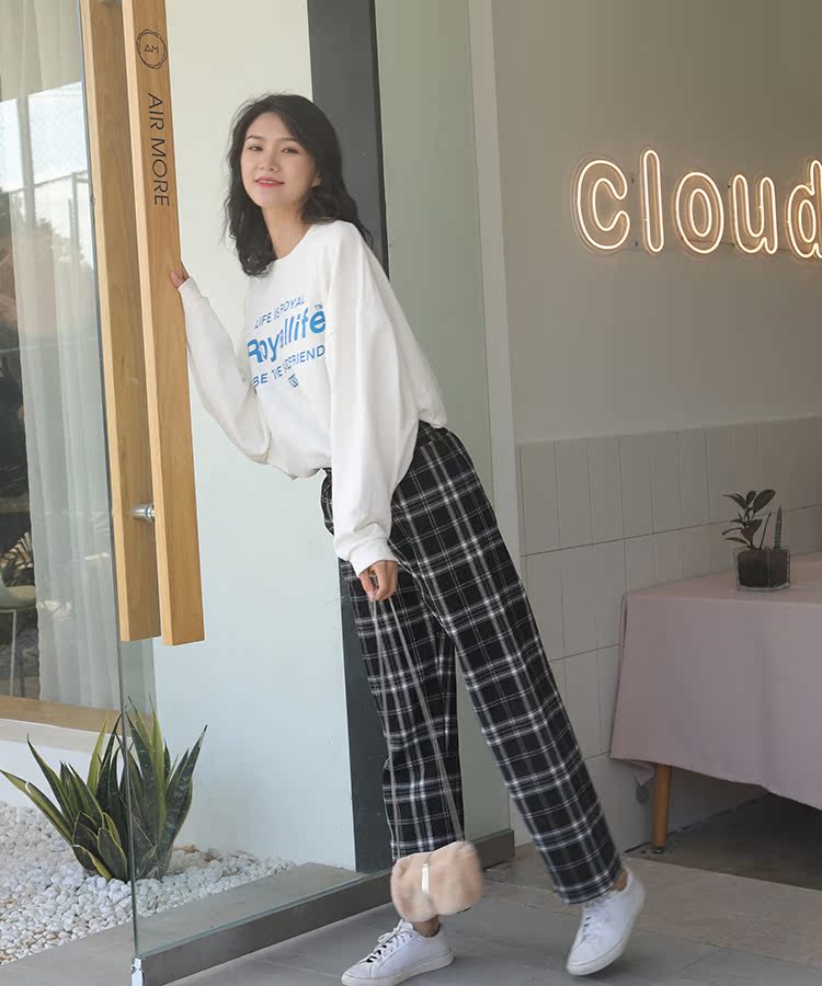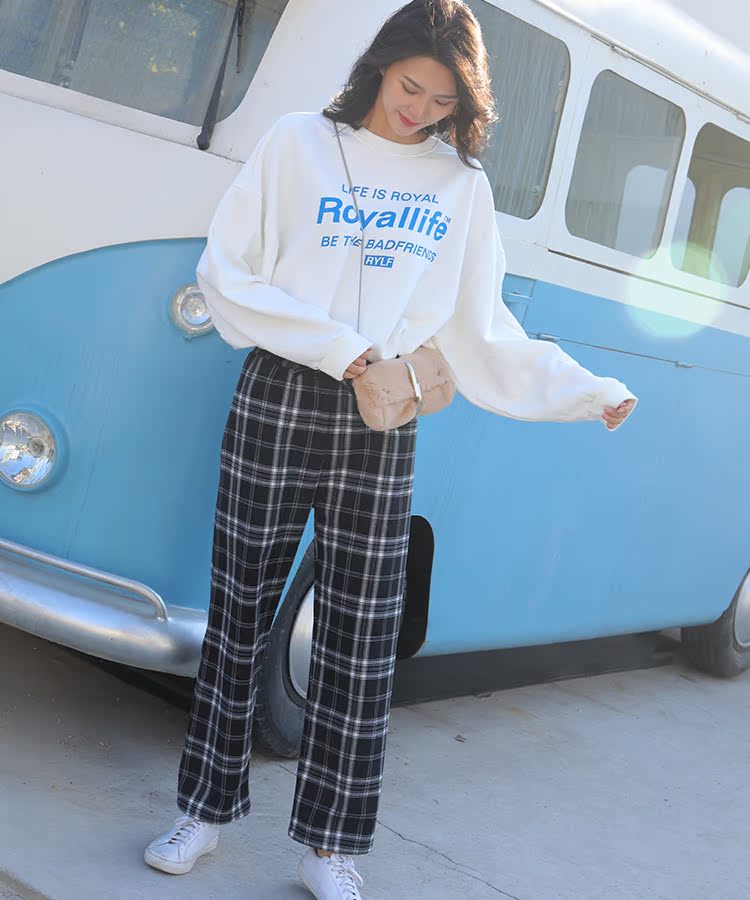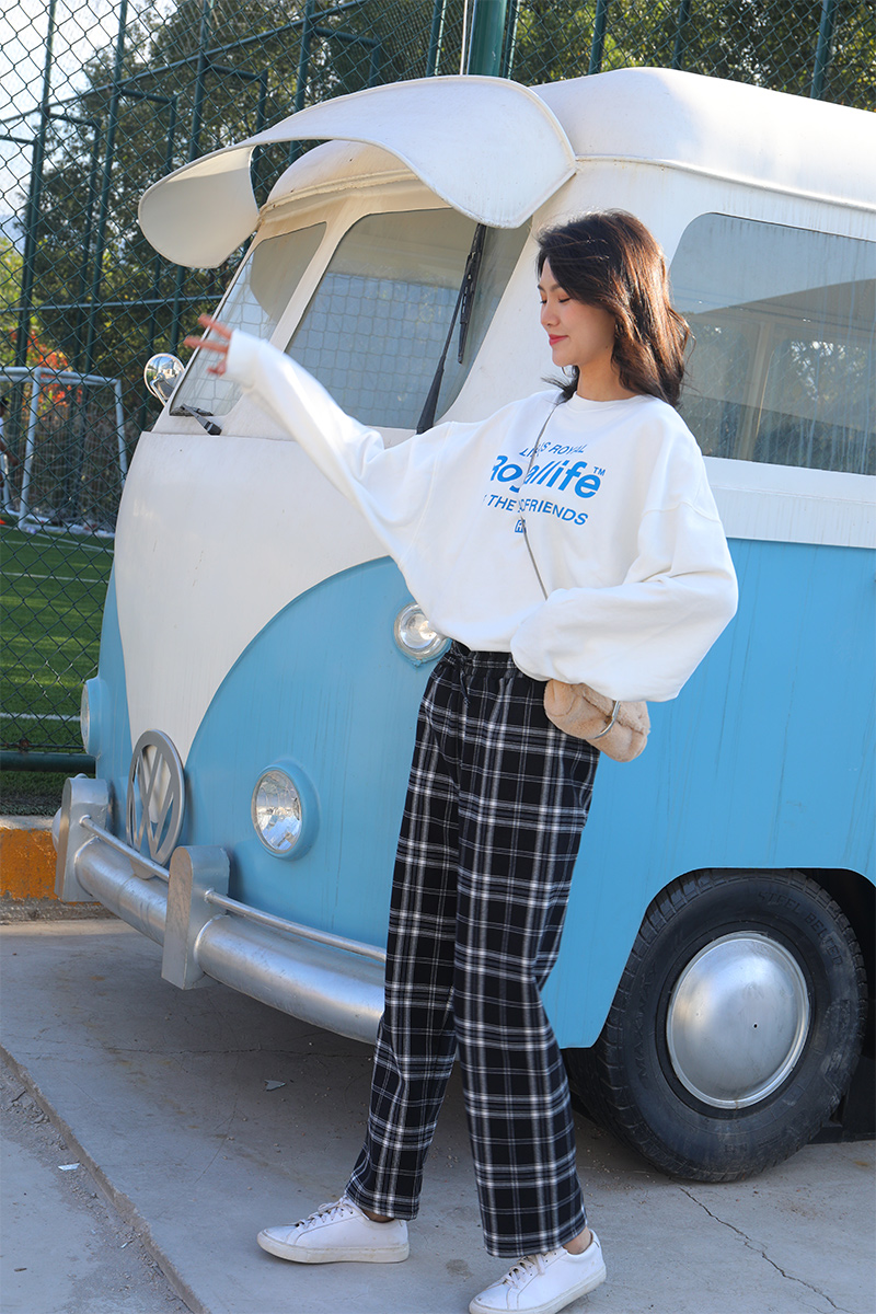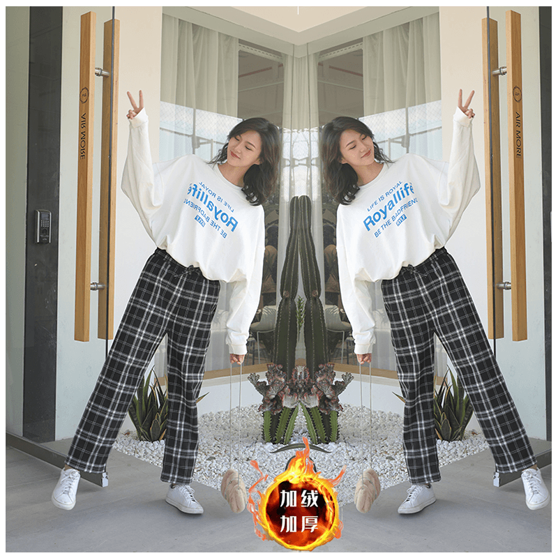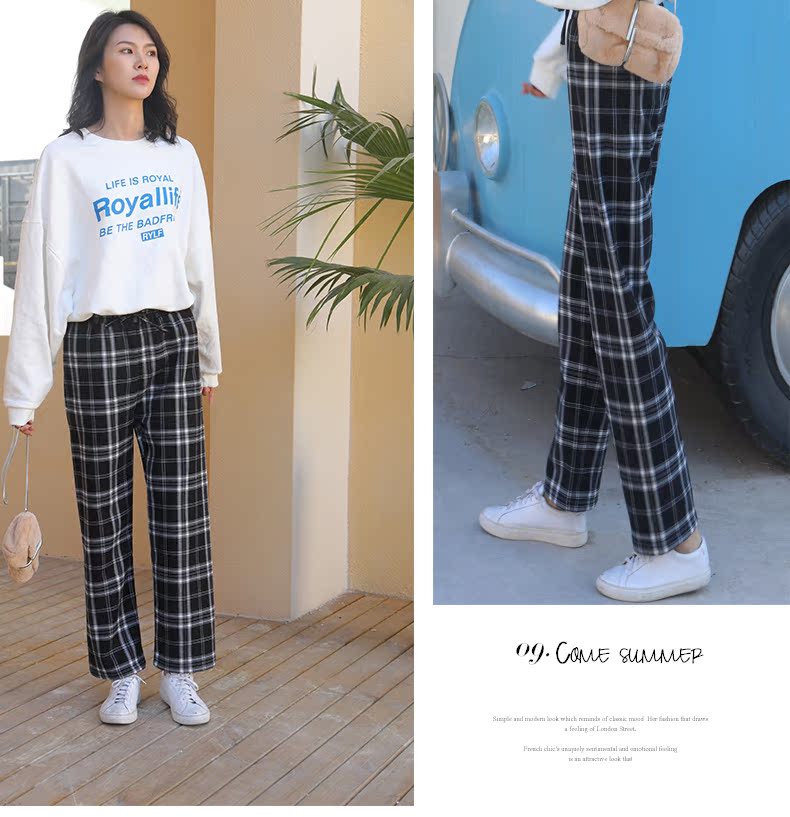 黑白格子阔腿裤女宽松秋冬韩版2019新款复古垂感高腰直筒拖地裤子