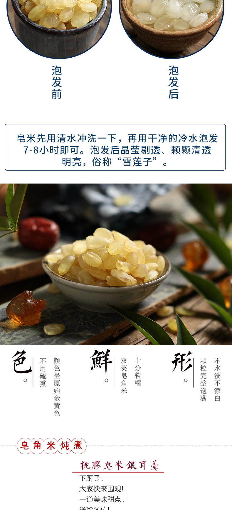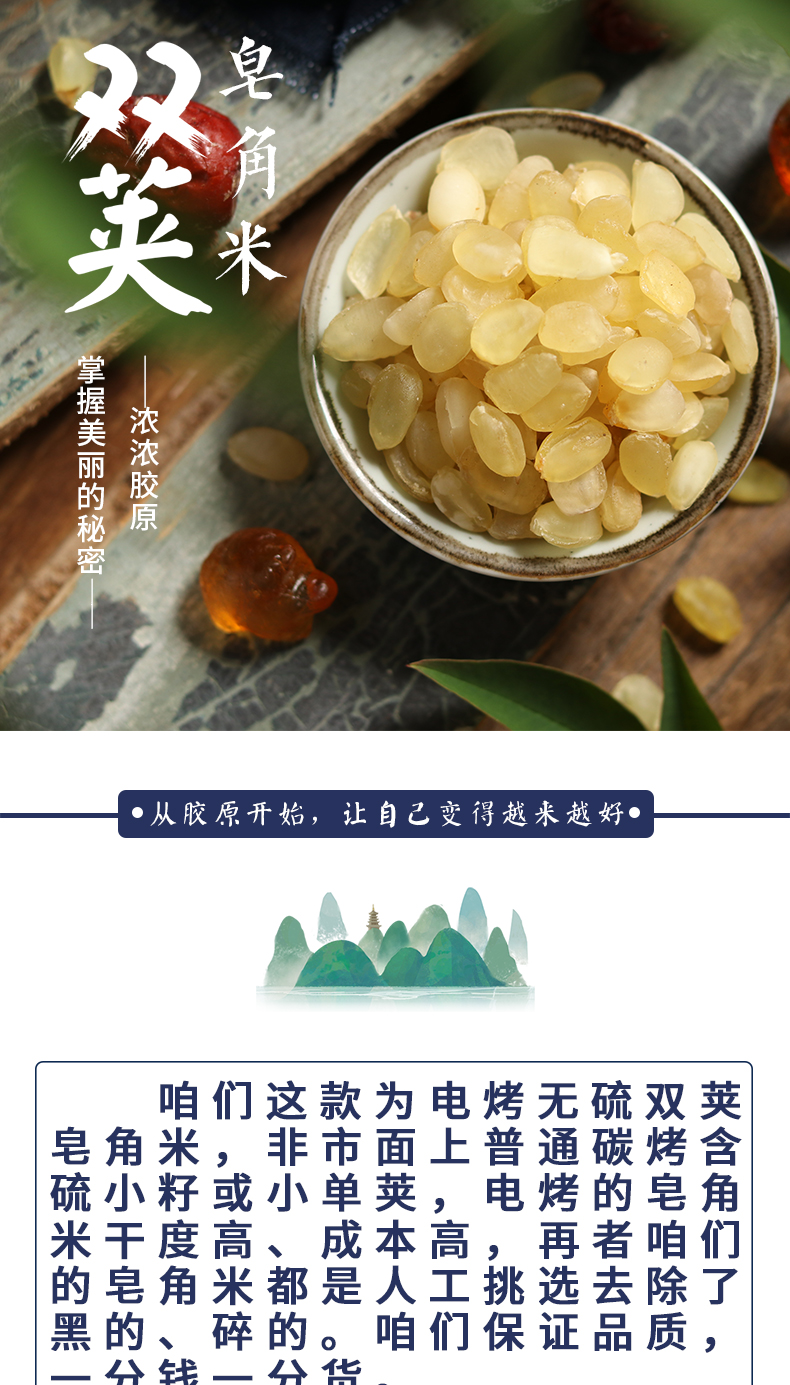 野生双夹皂角米,不添加任何防腐剂,母婴可食,胶质纯厚,爽口软糯,清肝明目,健脾滋肾,祛痰开窍,疏肠利尿,是调节人体肝脏功能的天然滋补品,更是女性美容养颜必备膳食,老少皆宜,居家必备膳食。