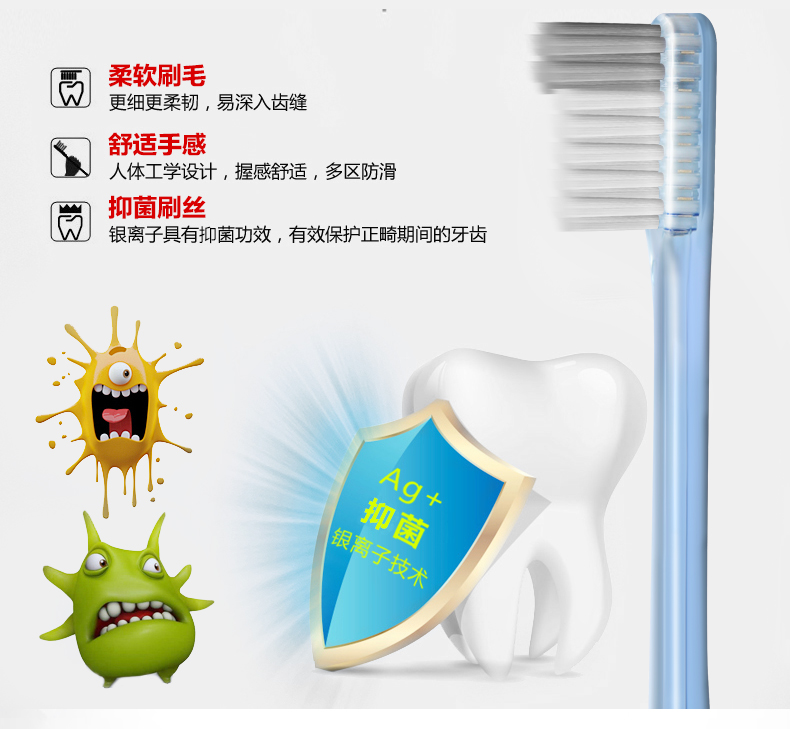 天猫优选,品质保证!银离子软毛设计,有效抑制细菌滋生,柔软舒适,抑菌透气,耐用速干,难得的好牙刷!