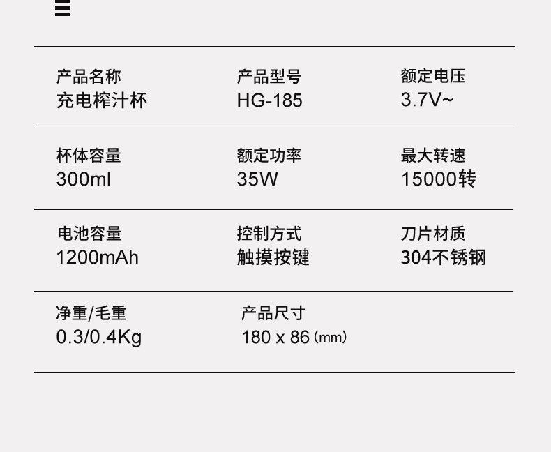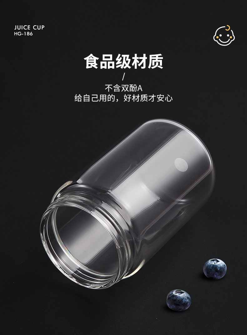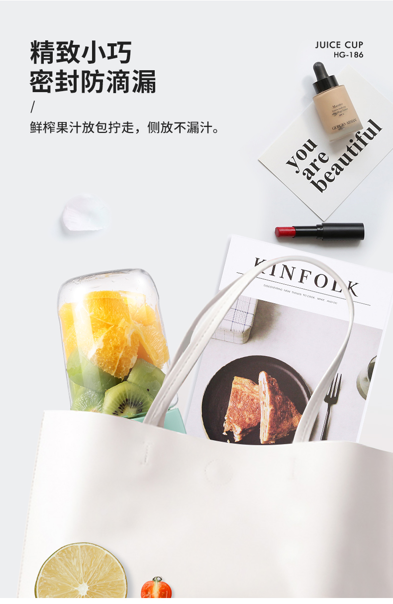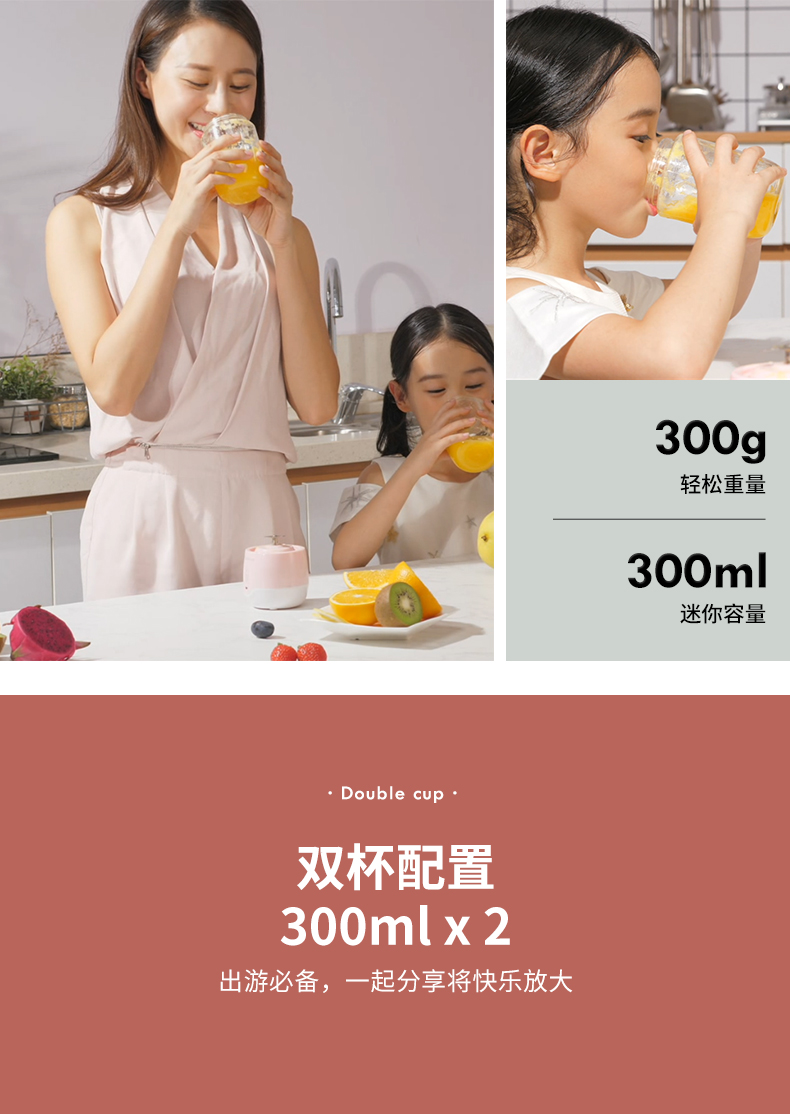 【手慢涨价,火爆大卖,天猫促销,1年免费换新!四叶刀头】搅打彻底,食品级材质的杯体,不爆裂,耐摔耐撞,一次充电约可榨10杯,长按两秒启动,快速榨汁,口感细腻顺滑,随时随地都可以获取美味果汁
