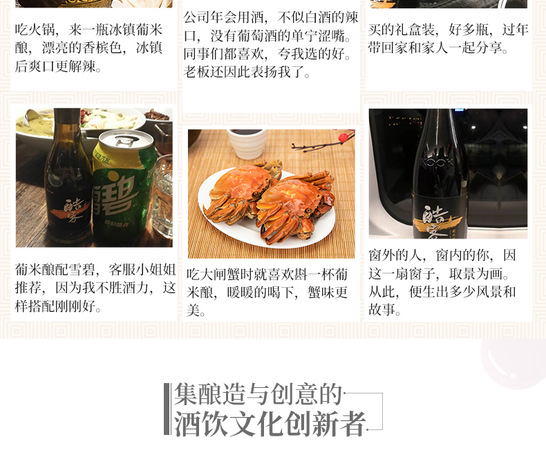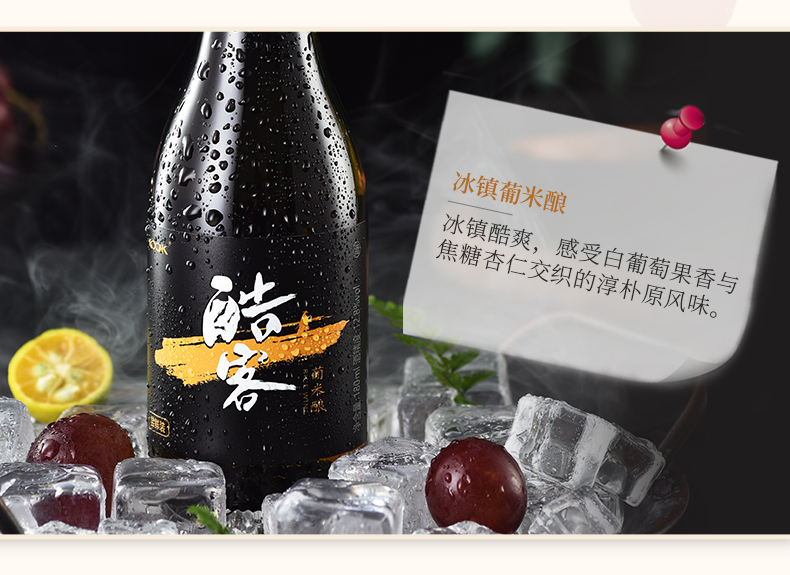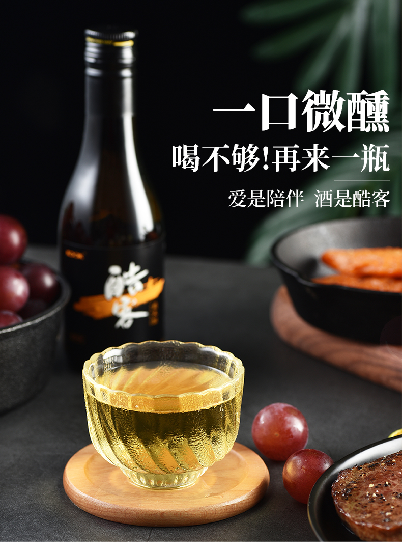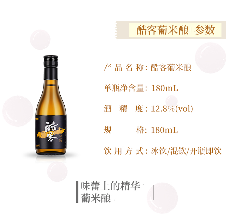 酷客KOOK新品葡米酿12.8度180ml颜色明亮,色泽纯净,酒香馥郁,顺滑爽口,醇香甘冽,与亲朋好友相饮,是别样暖暖的情意。 ,