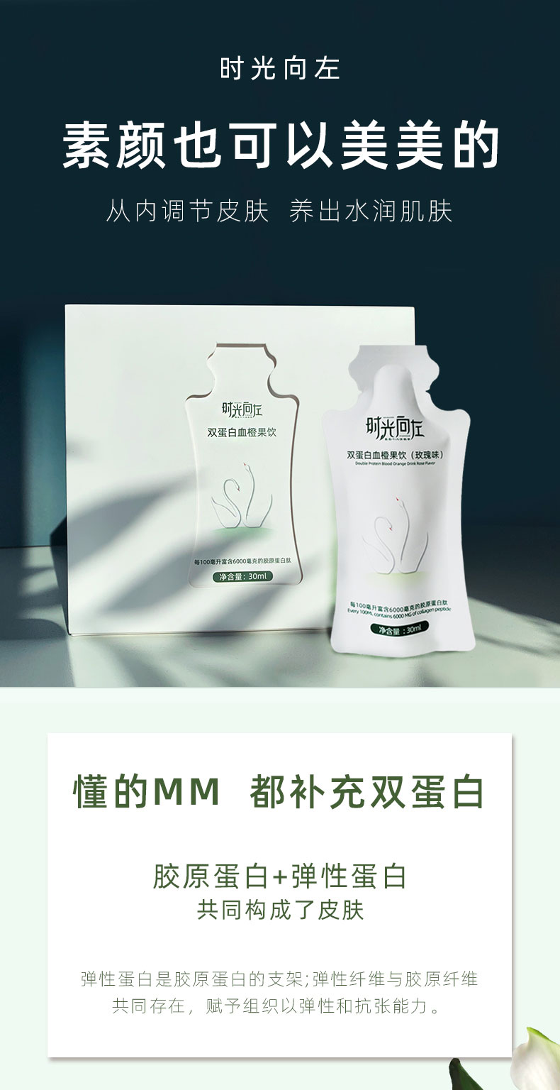时光向左胶原蛋白血橙饮双蛋白口服液挪威纯野生鳕鱼胶蛋白,深海鲣鱼弹性蛋白天然萃取,口感好吸收佳,易于吸收,从内调节皮肤,养出水嫩肌肤,喝出水嫩嫩婴儿肌
