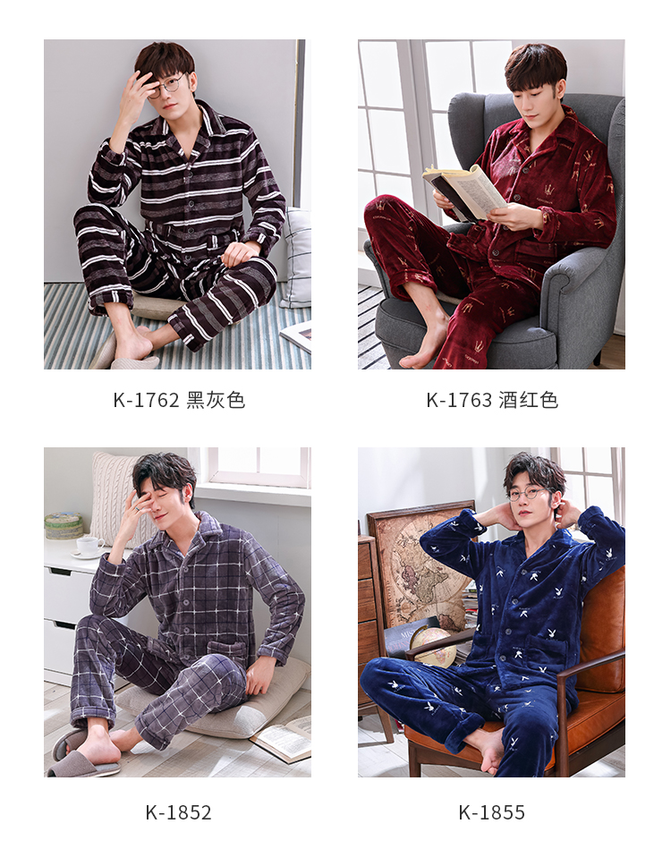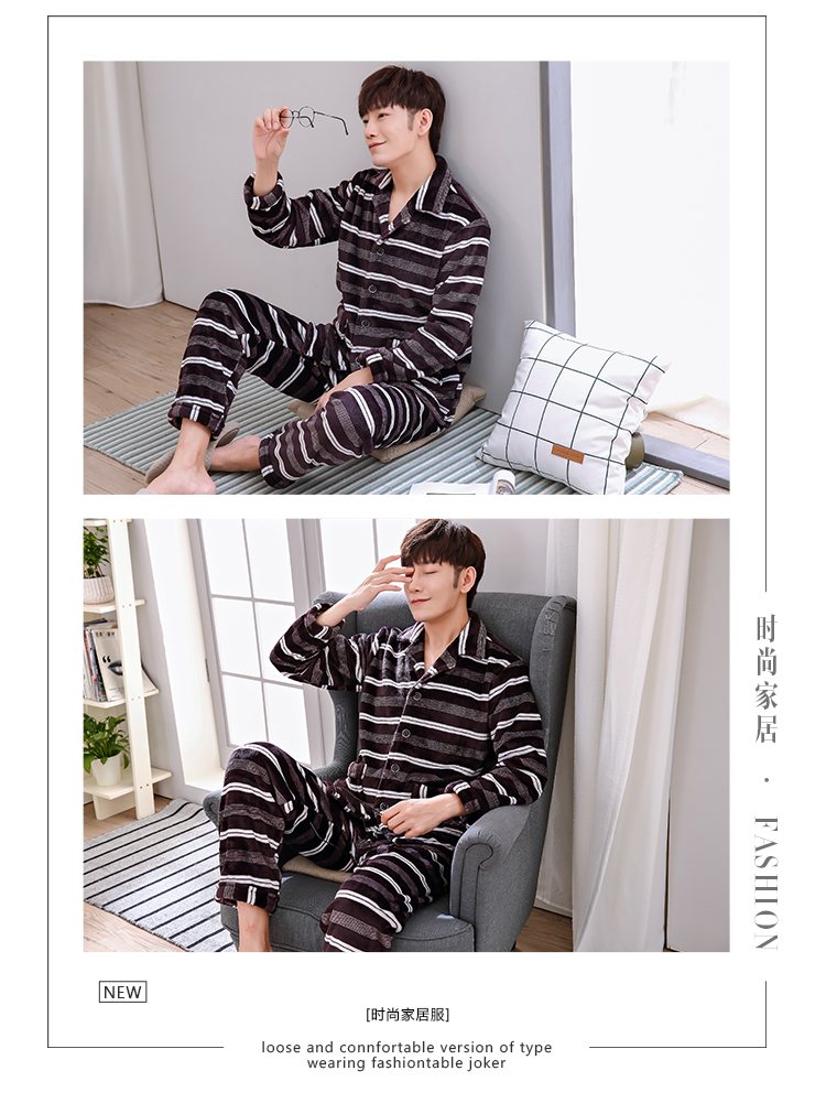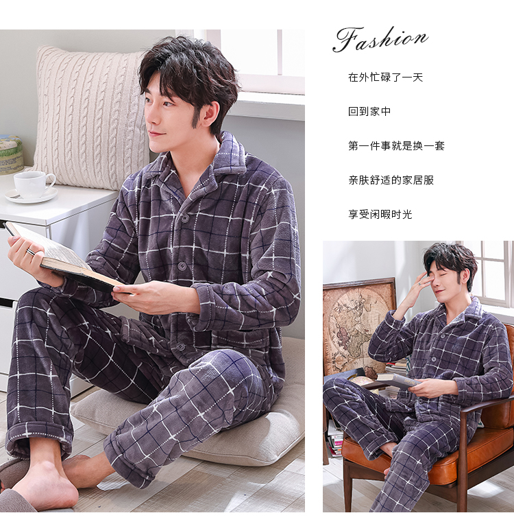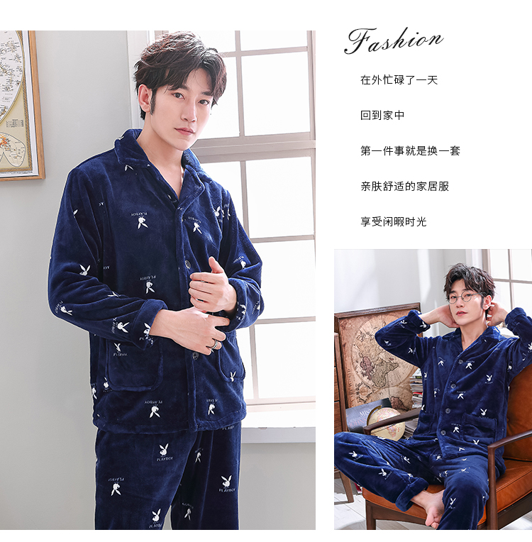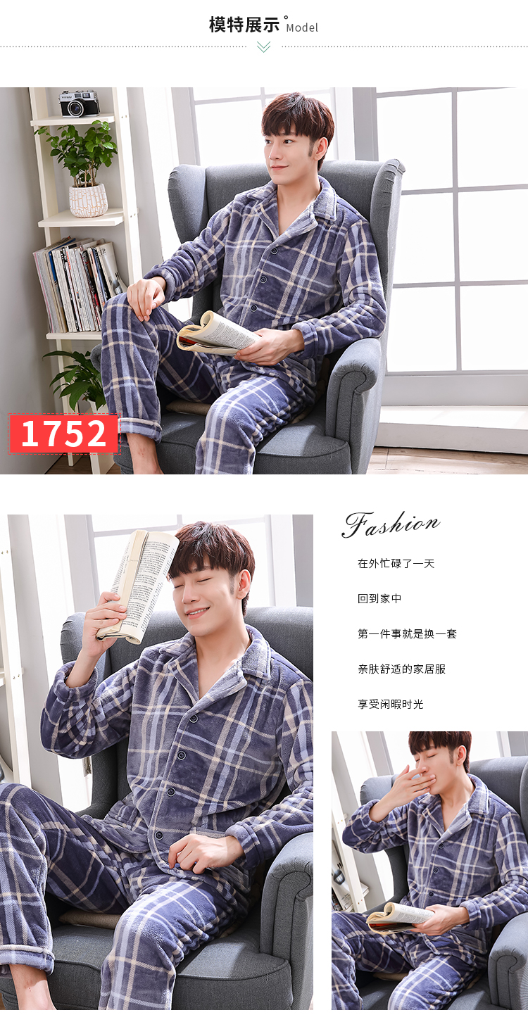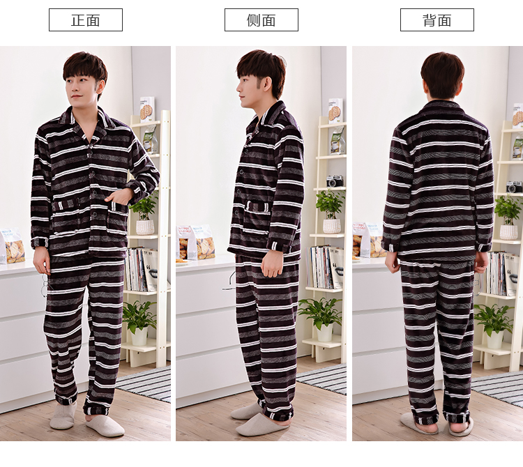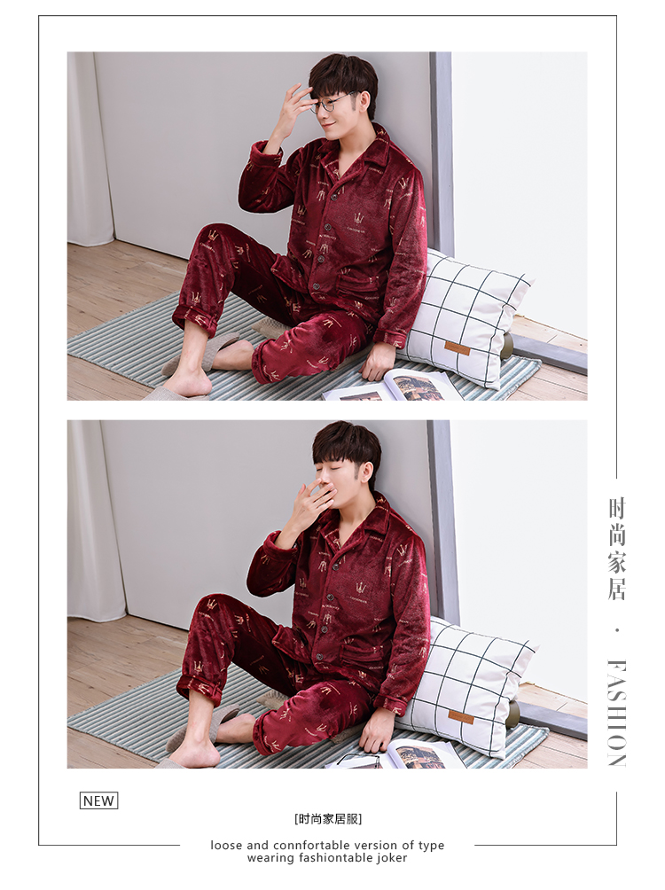 卡欧澜中老年珊瑚绒睡衣男士秋冬季大码加厚加绒法兰绒家居服套装