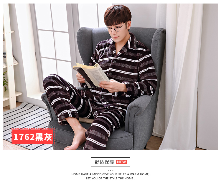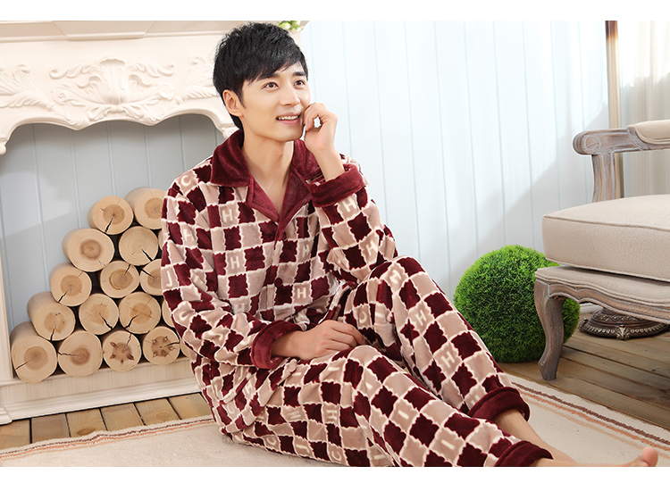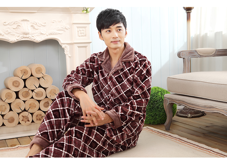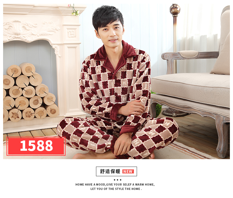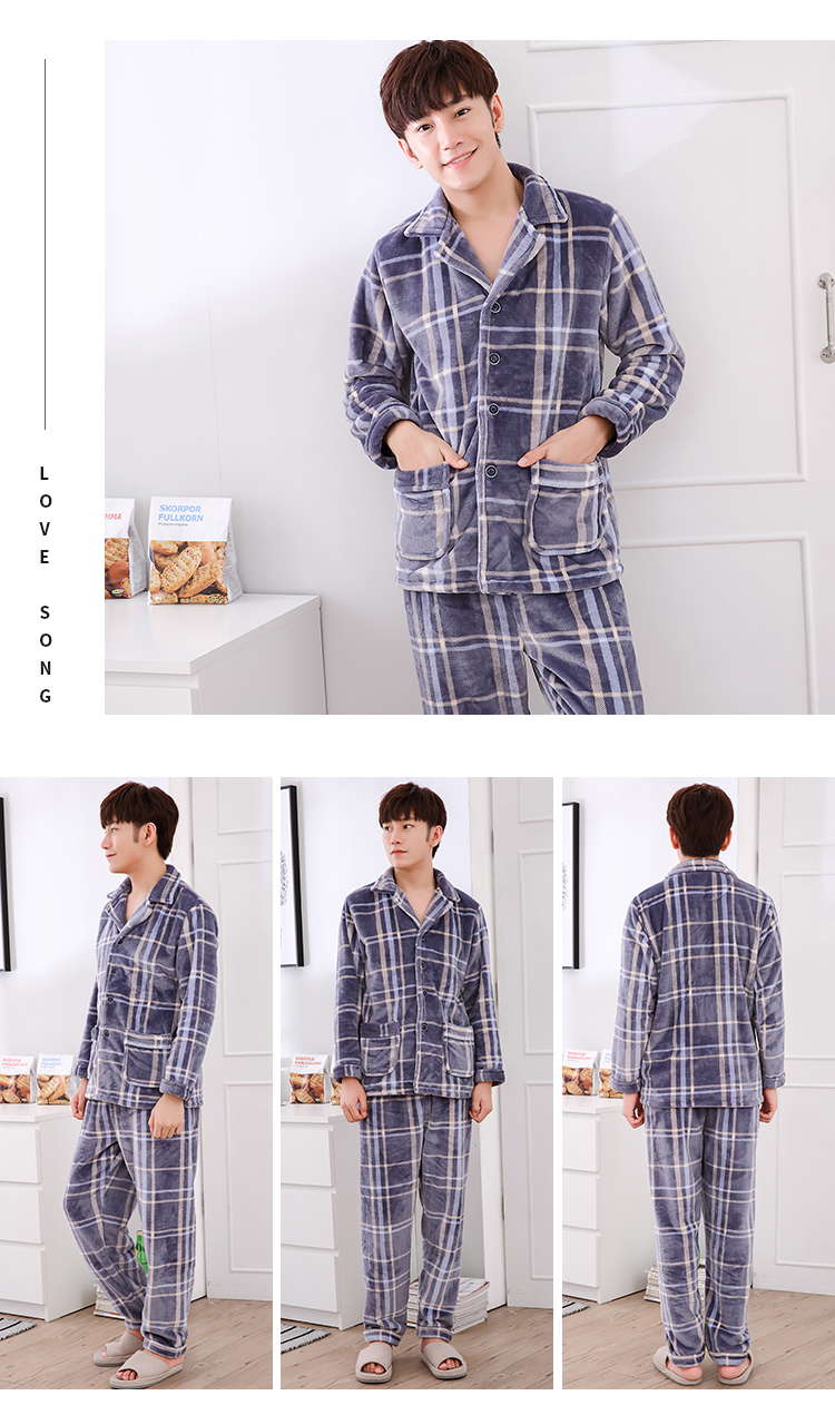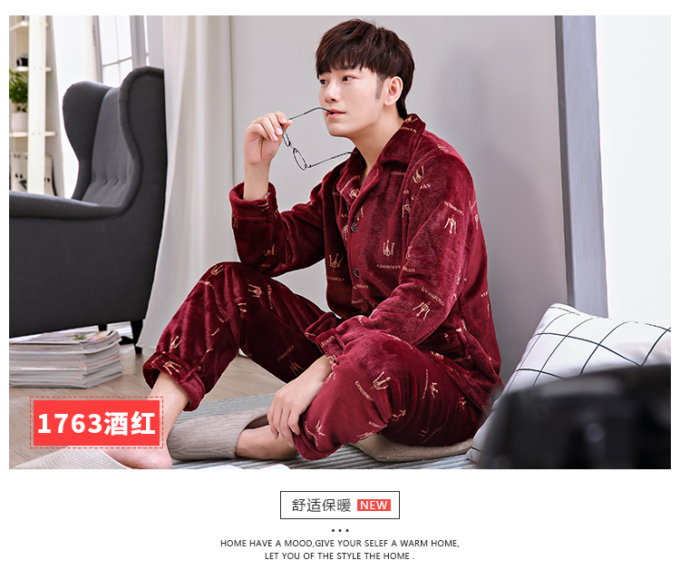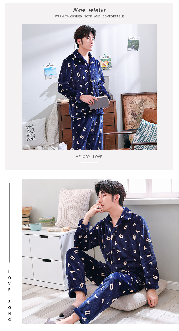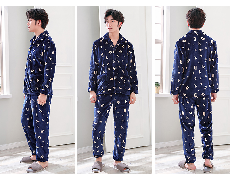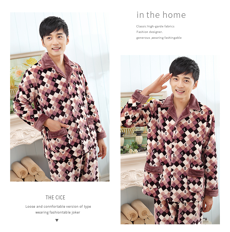 卡欧澜中老年珊瑚绒睡衣男士秋冬季大码加厚加绒法兰绒家居服套装