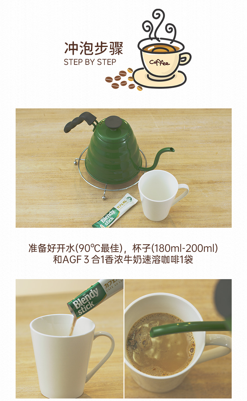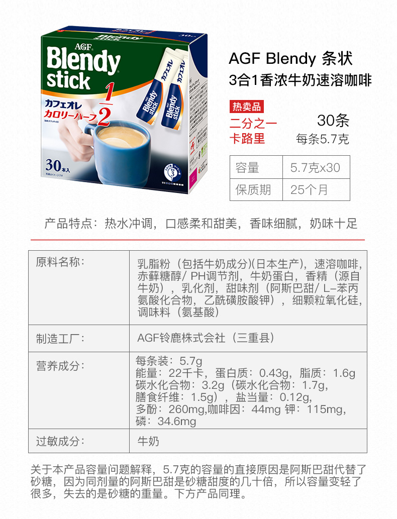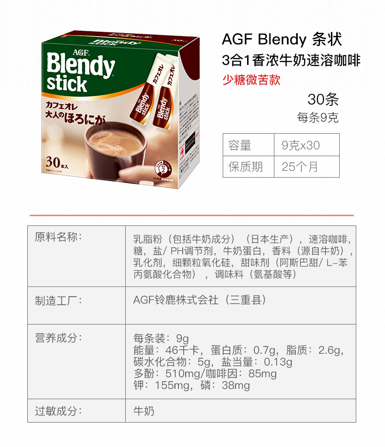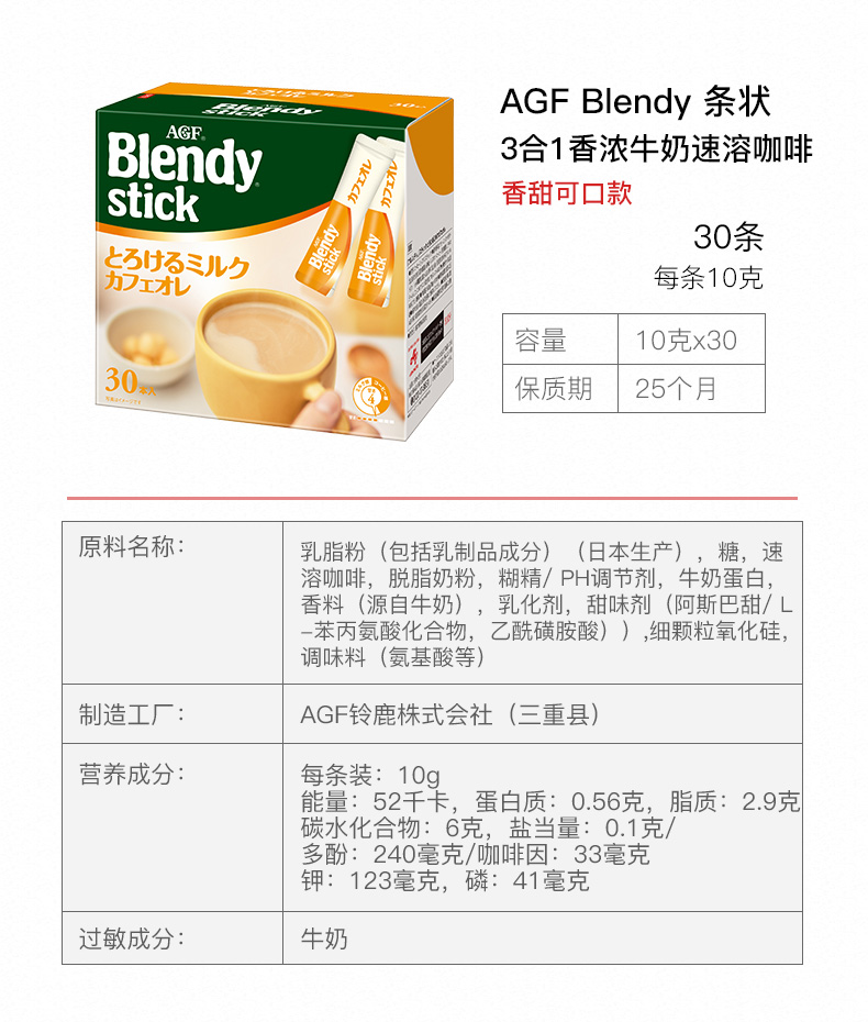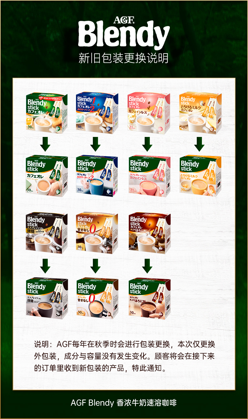 【AGF海外旗舰店,满二件8折】日本进口,三合一香浓牛奶速溶咖啡30条小盒装,深度烘焙的咖啡豆咖啡感更浓醇。使用阿斯巴甜增加甜味,热量和糖分比普通速溶更低。
