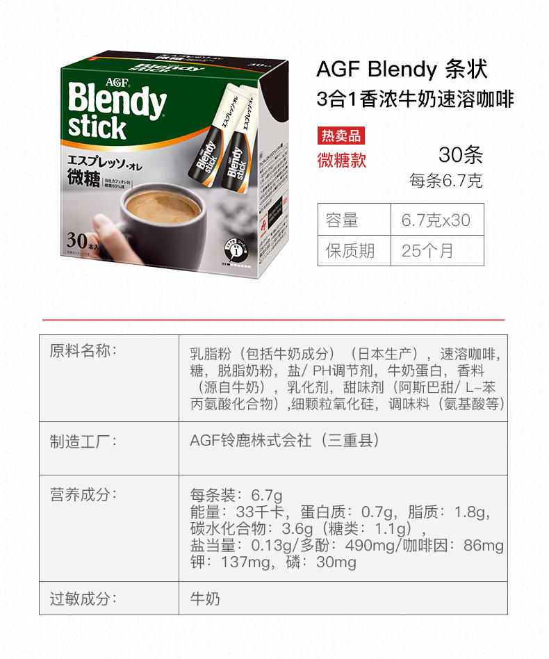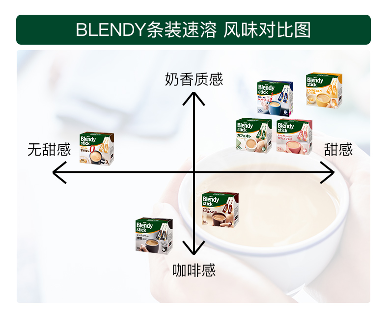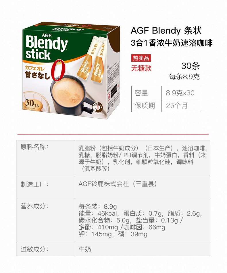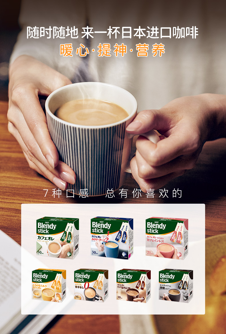 AGF Blendy日本蓝山风味咖啡粉原味进口速溶咖啡脱脂牛奶咖啡条装