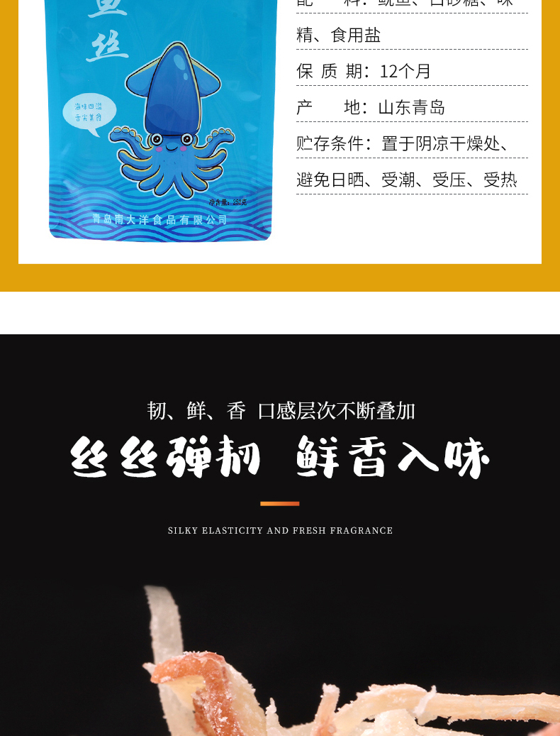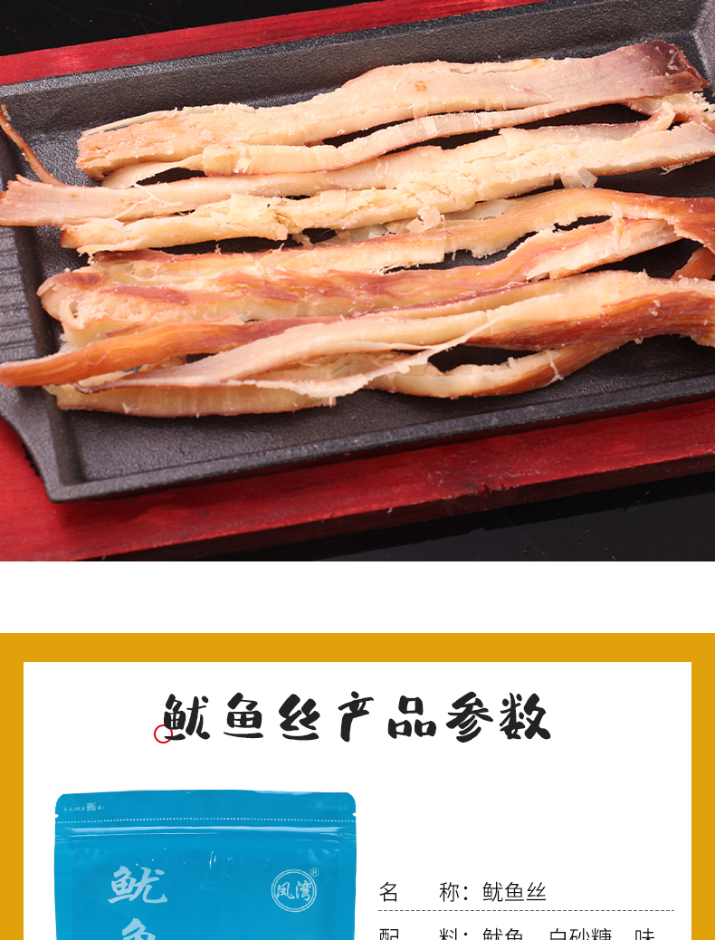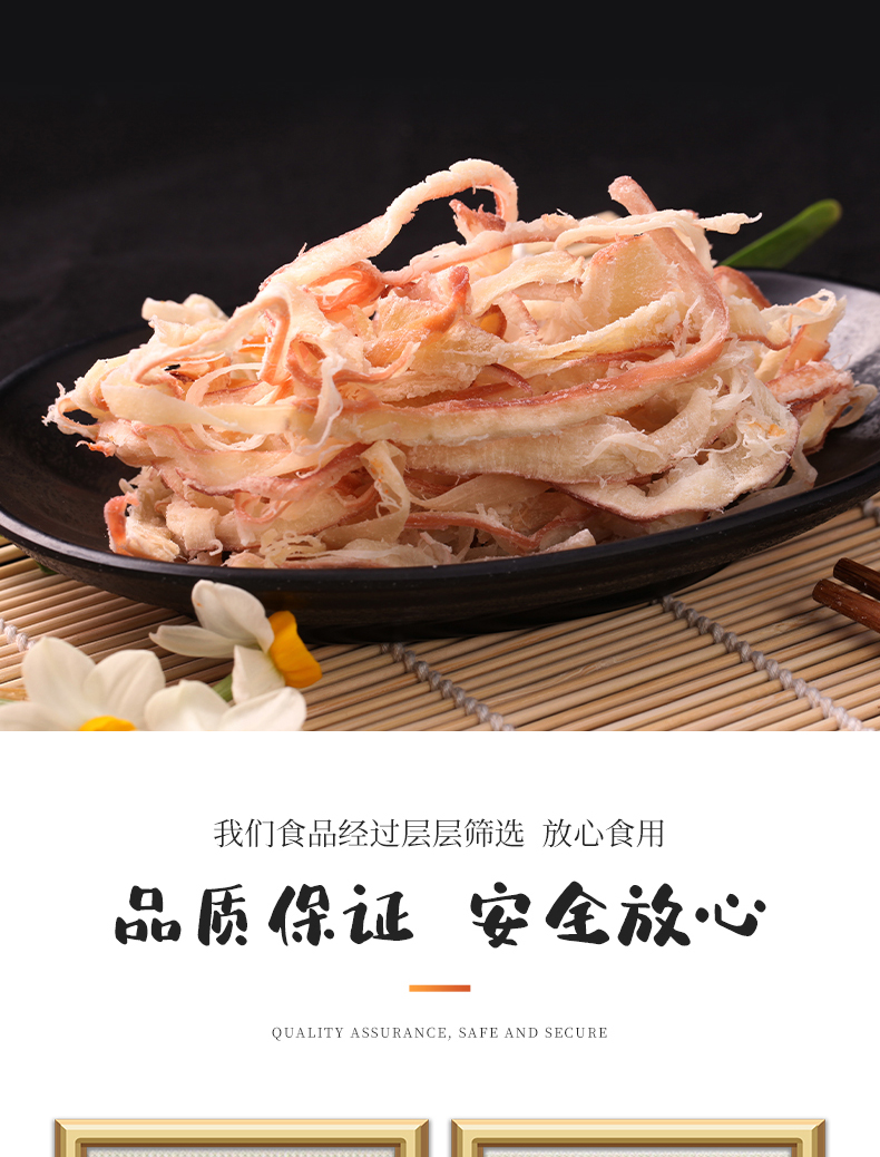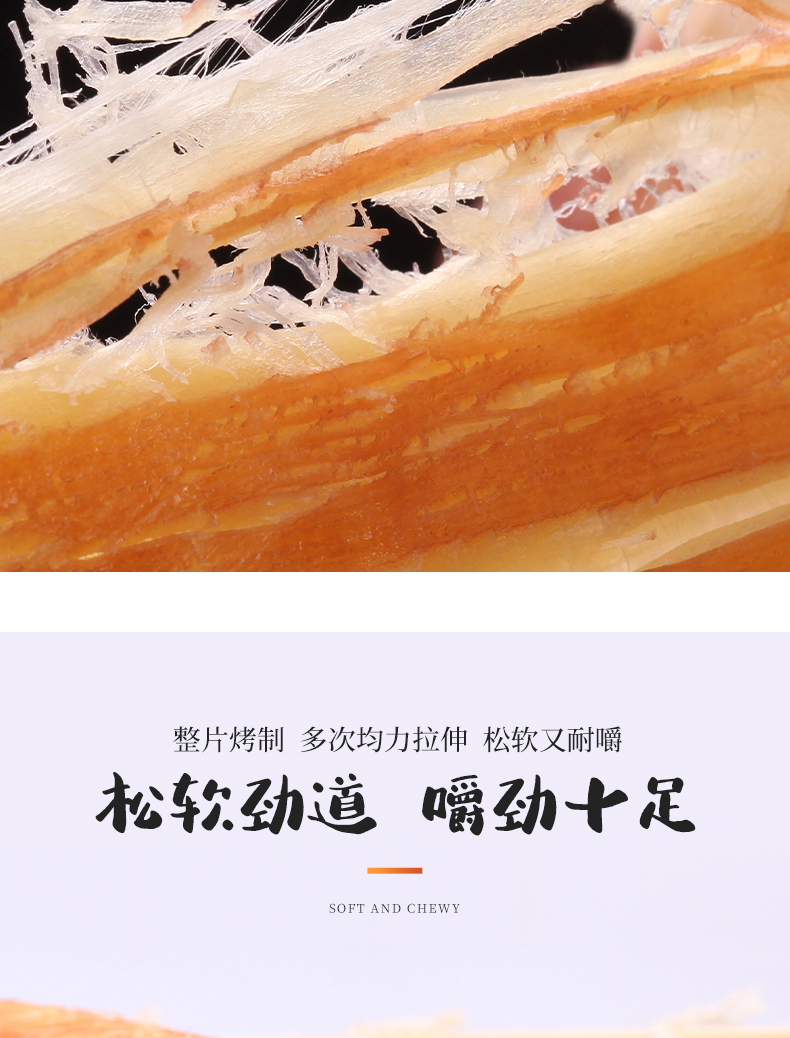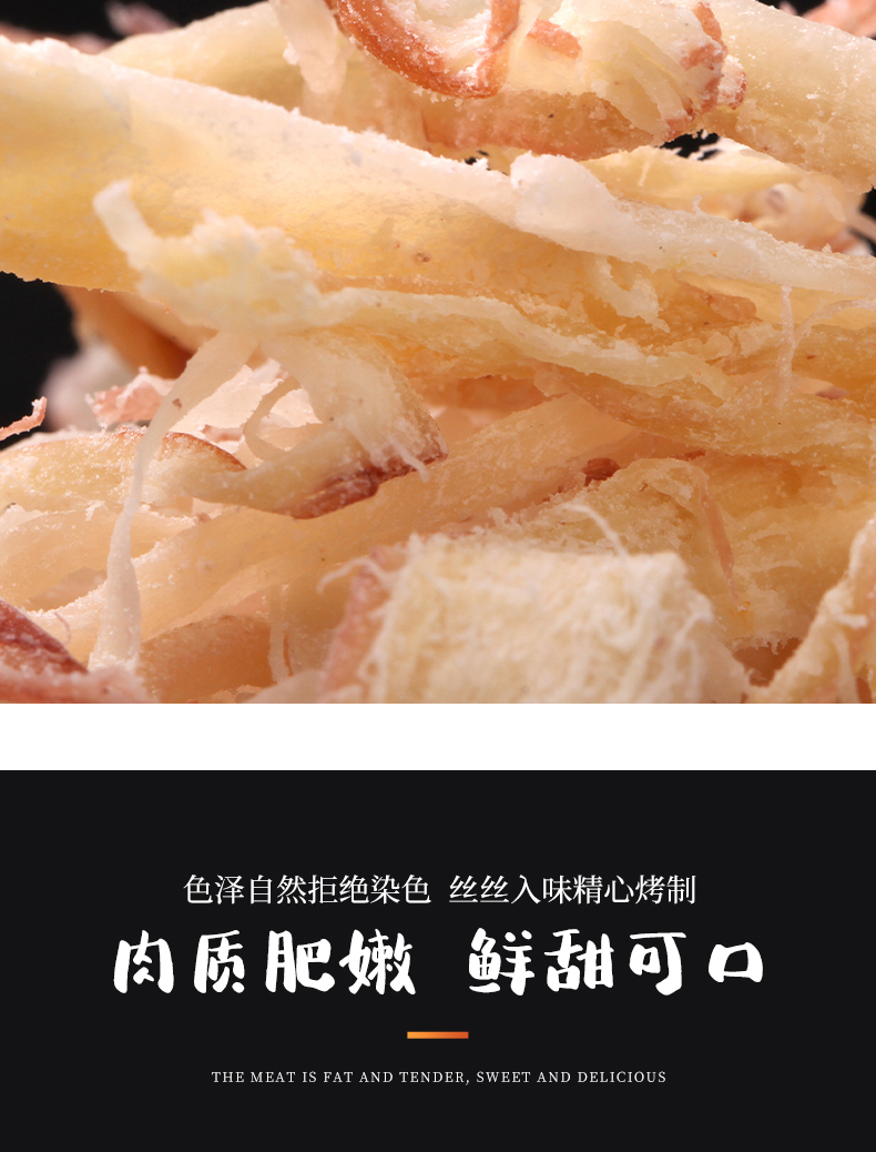 颠覆你的味觉,与市场不一样的鱿鱼丝,高温熟化,恒温锁鲜。细长有嚼劲。孕妇、儿童皆可放心食用。吃过的都说好!