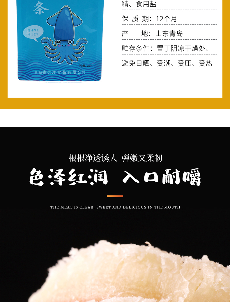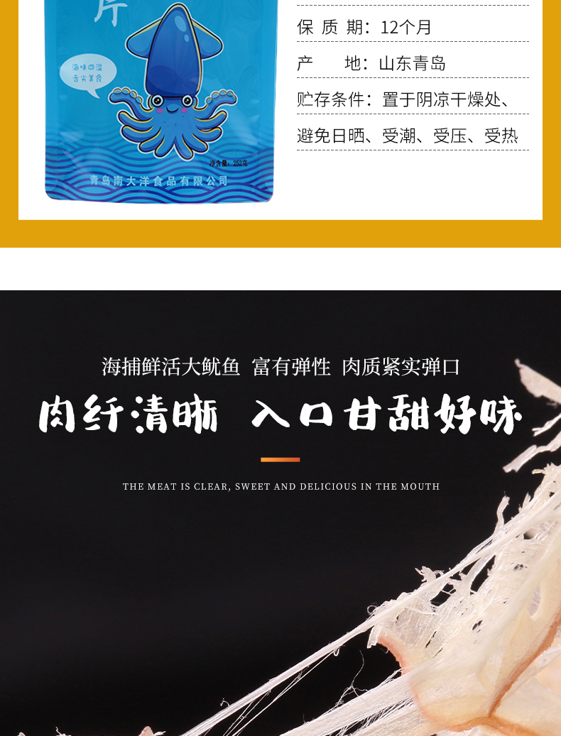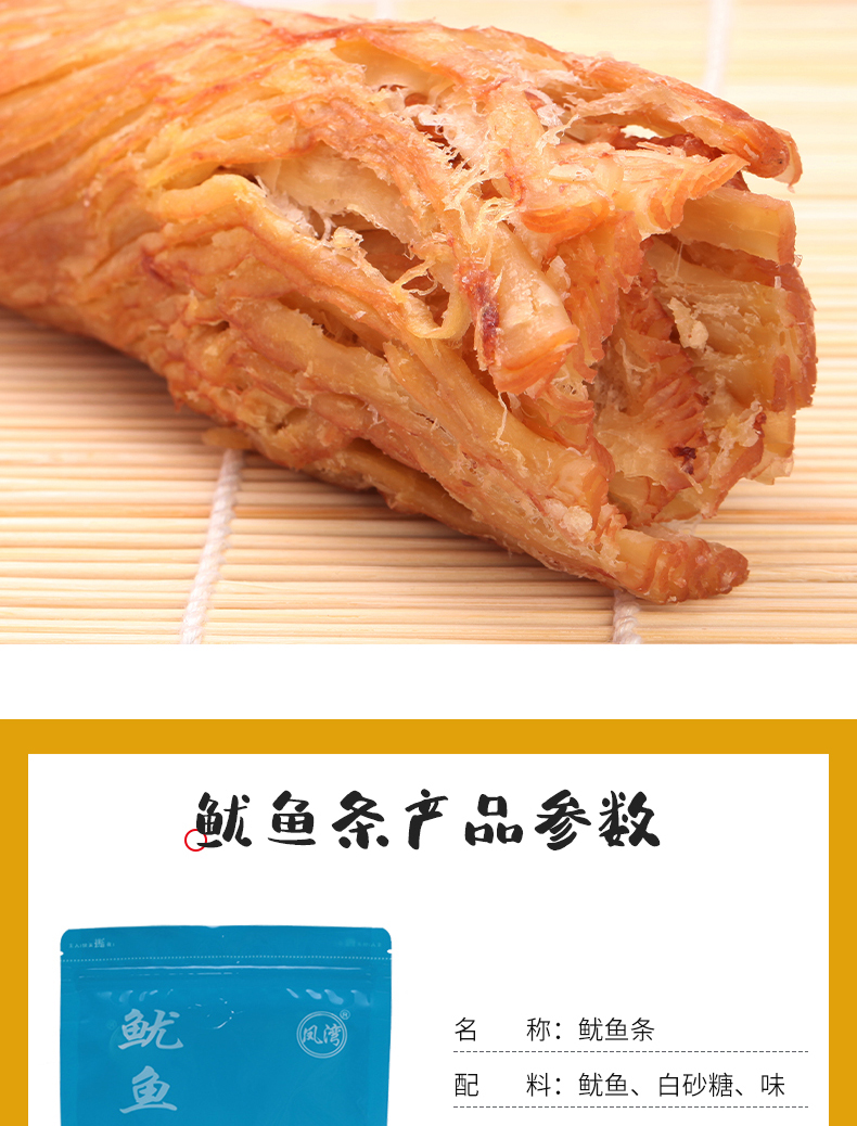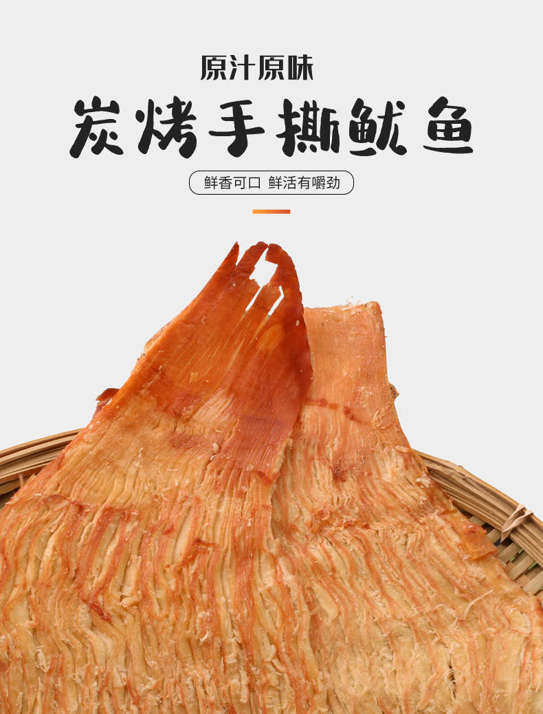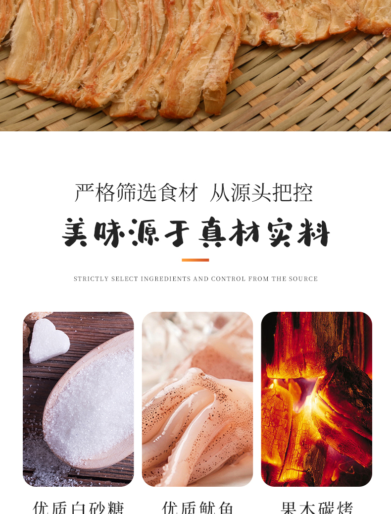 颠覆你的味觉,与市场不一样的鱿鱼丝,高温熟化,恒温锁鲜。细长有嚼劲。孕妇、儿童皆可放心食用。吃过的都说好!