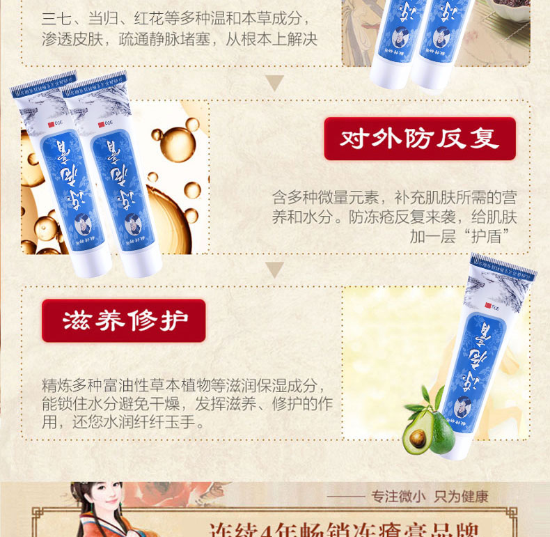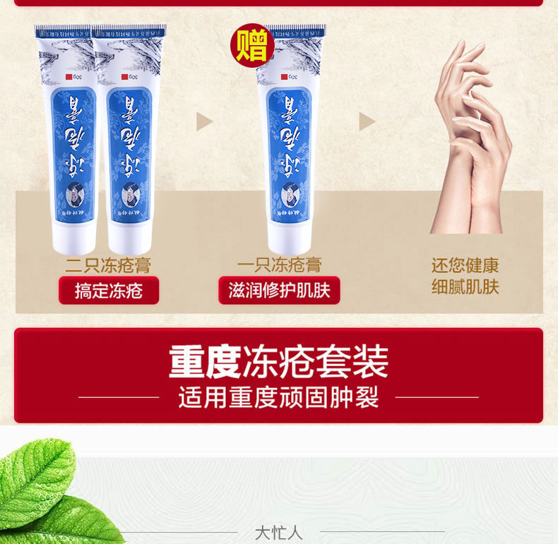 超值优惠冻疮膏,买2送1,买3送2,秋冬居家必备,适用轻度微红发痒,滋润修护肌肤,适用重度顽固肿裂,搞定冻疮,内含本草精粹,温和滋养,效果很好!快来抢购吧!