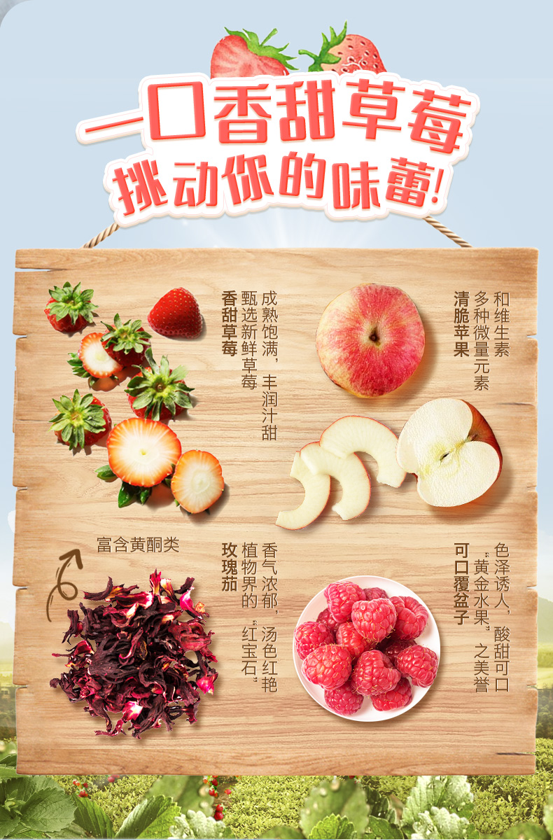 【买就送5包果茶包!】花草茶先行者,水果风暴,是水果也是茶,美味多彩,给您的味蕾放个假,能干吃的果粒茶,颗颗真果粒,色彩缤纷,酸甜爽口,开启一场浪漫的花果盛宴,挑逗你的味蕾