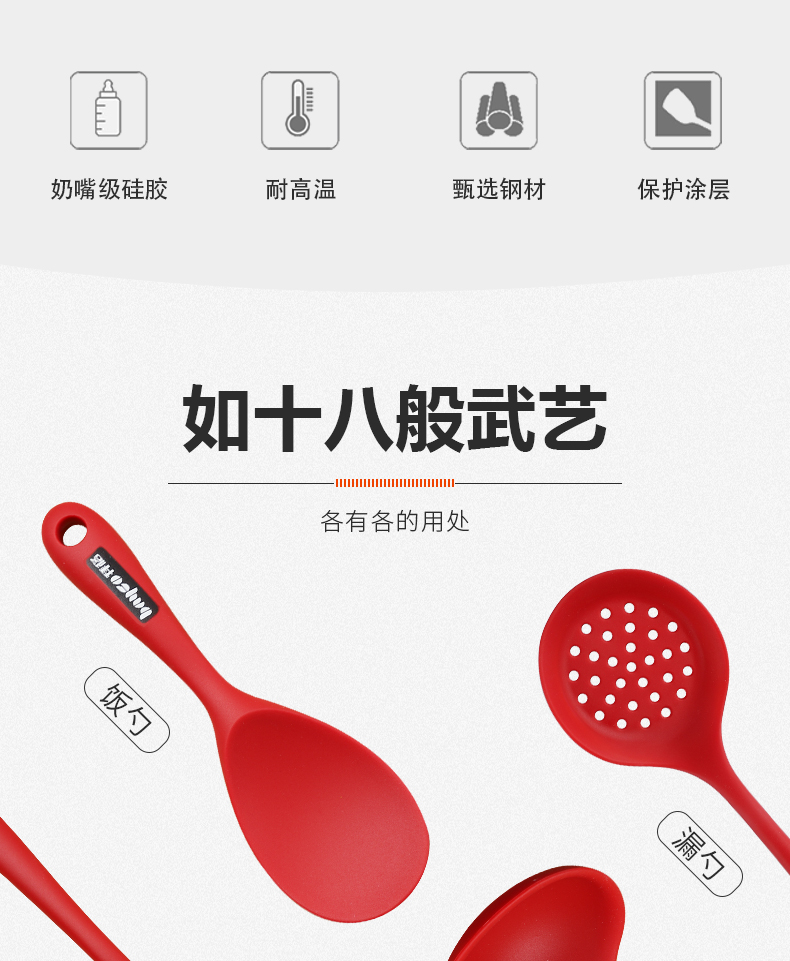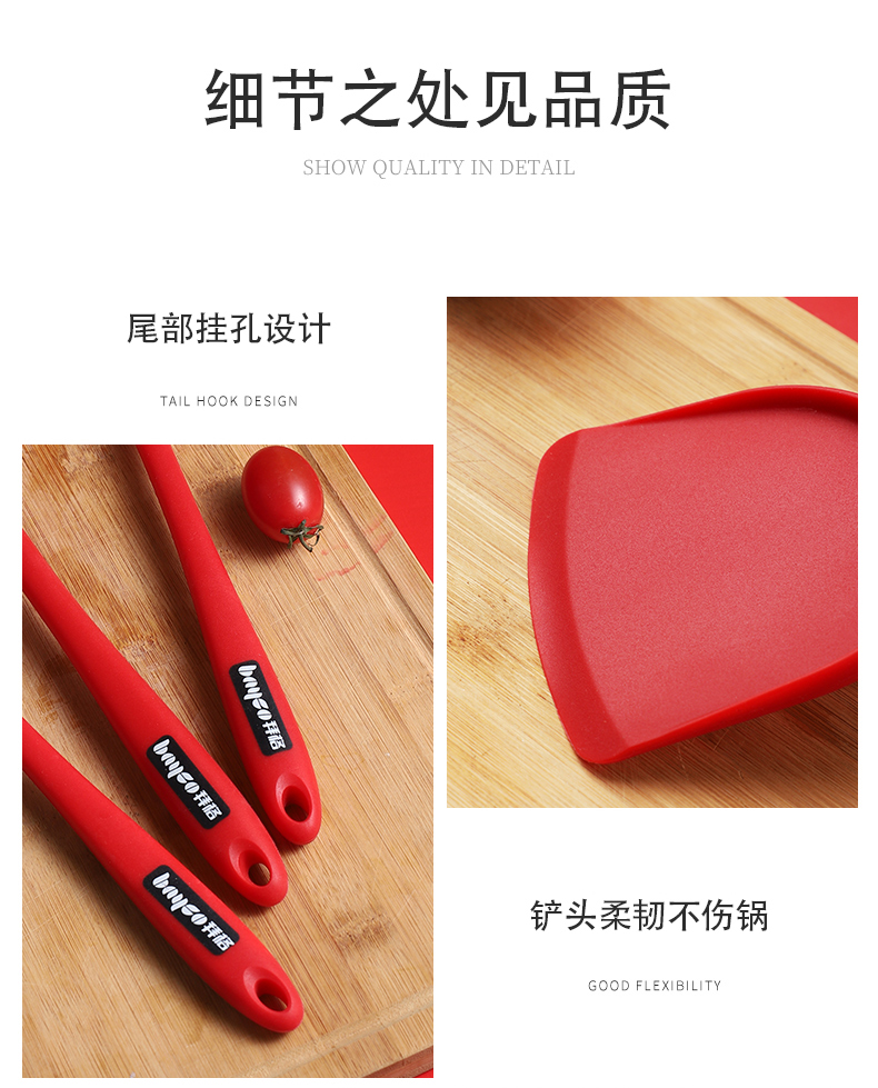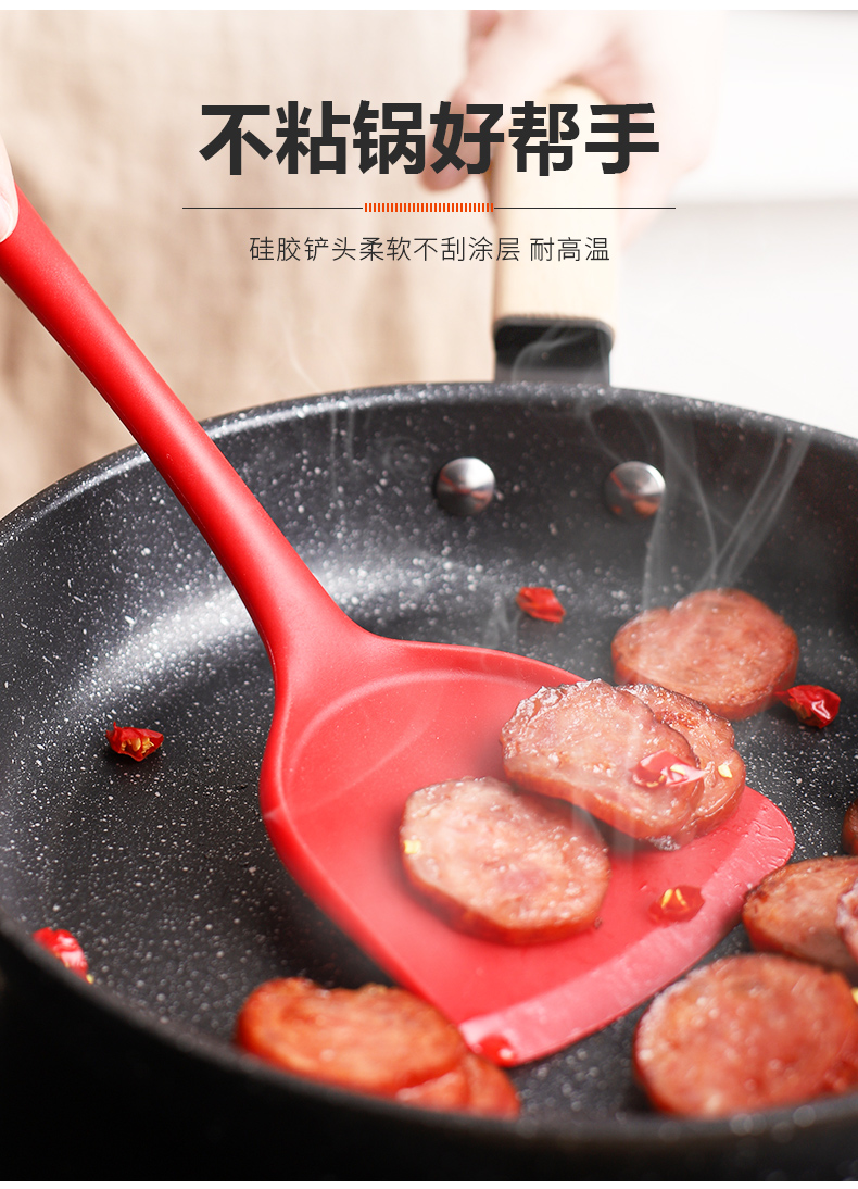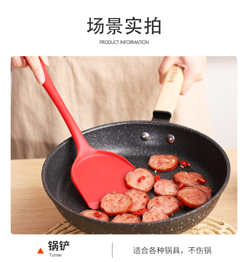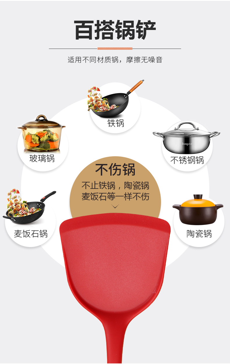 婴儿奶嘴级硅胶,柔中带钢,保护涂层,尾部挂孔以及一体防烫设计,轻便顺手,易清洗耐高温不开裂不粘锅。不粘锅专用护锅厨具炒菜铲,用心选材,清洗超方便!