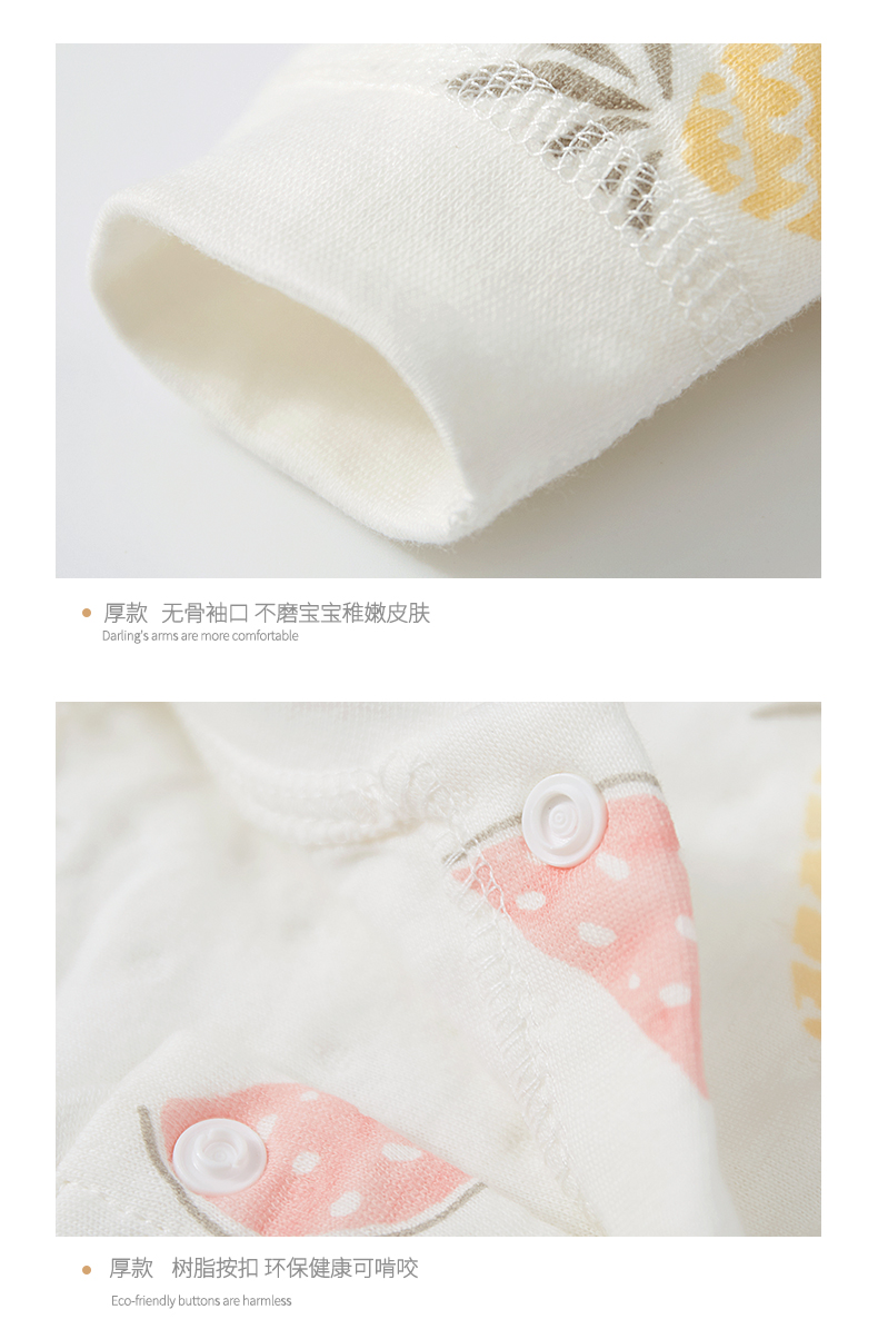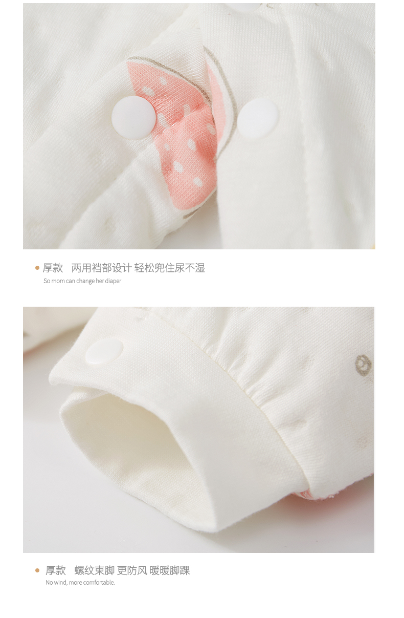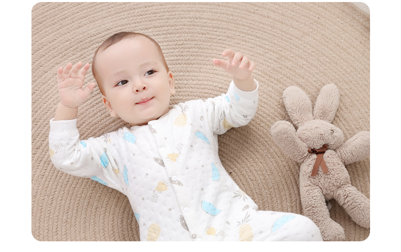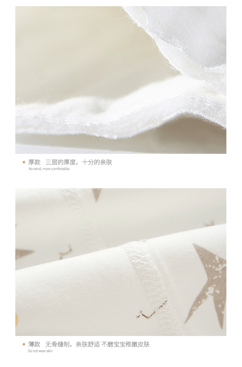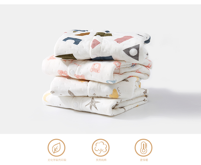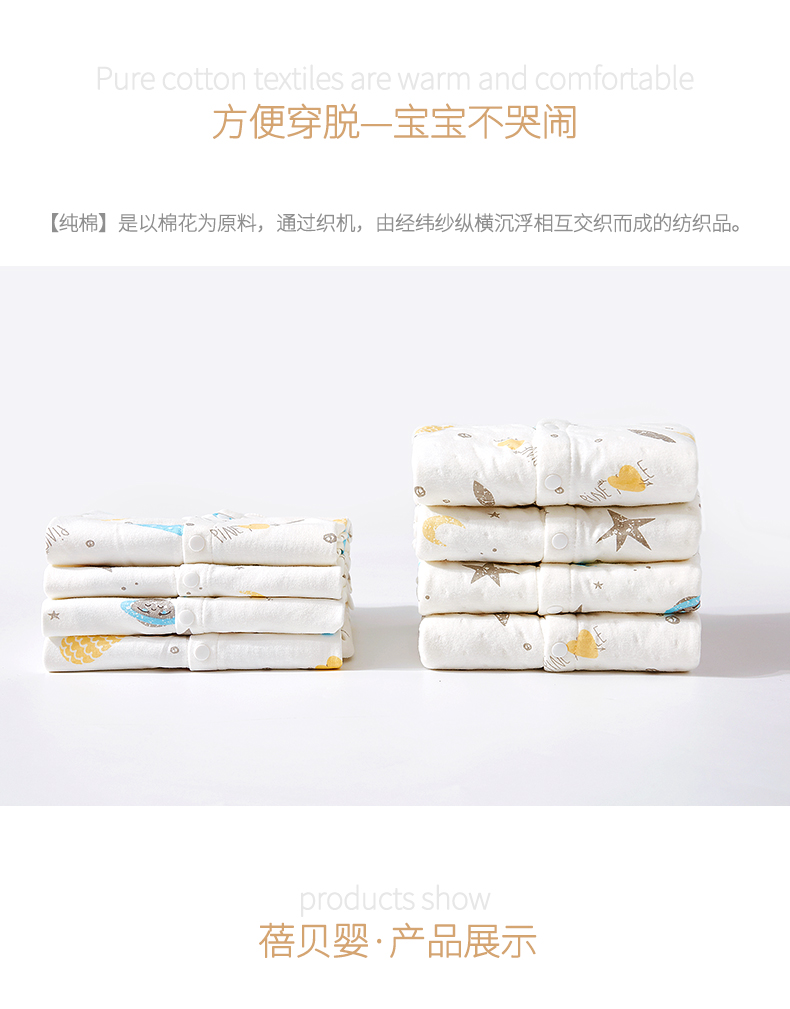 版型升级,优选精梳棉,A类品质更放心。无骨,亲肤,柔软,四季可穿,去荧光剂,立体循环透气,帮助宝宝有效调节,排除多余的热量。优质摁钮,方便妈妈更换纸尿裤