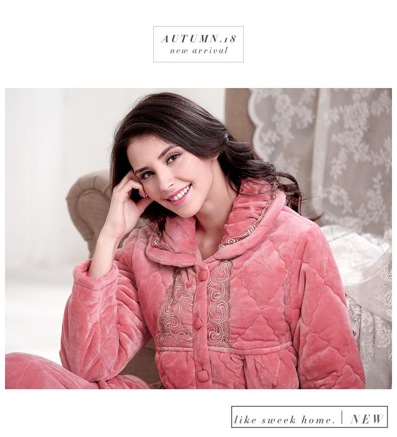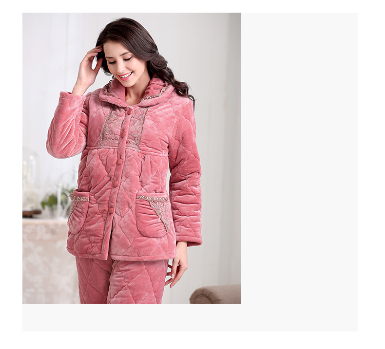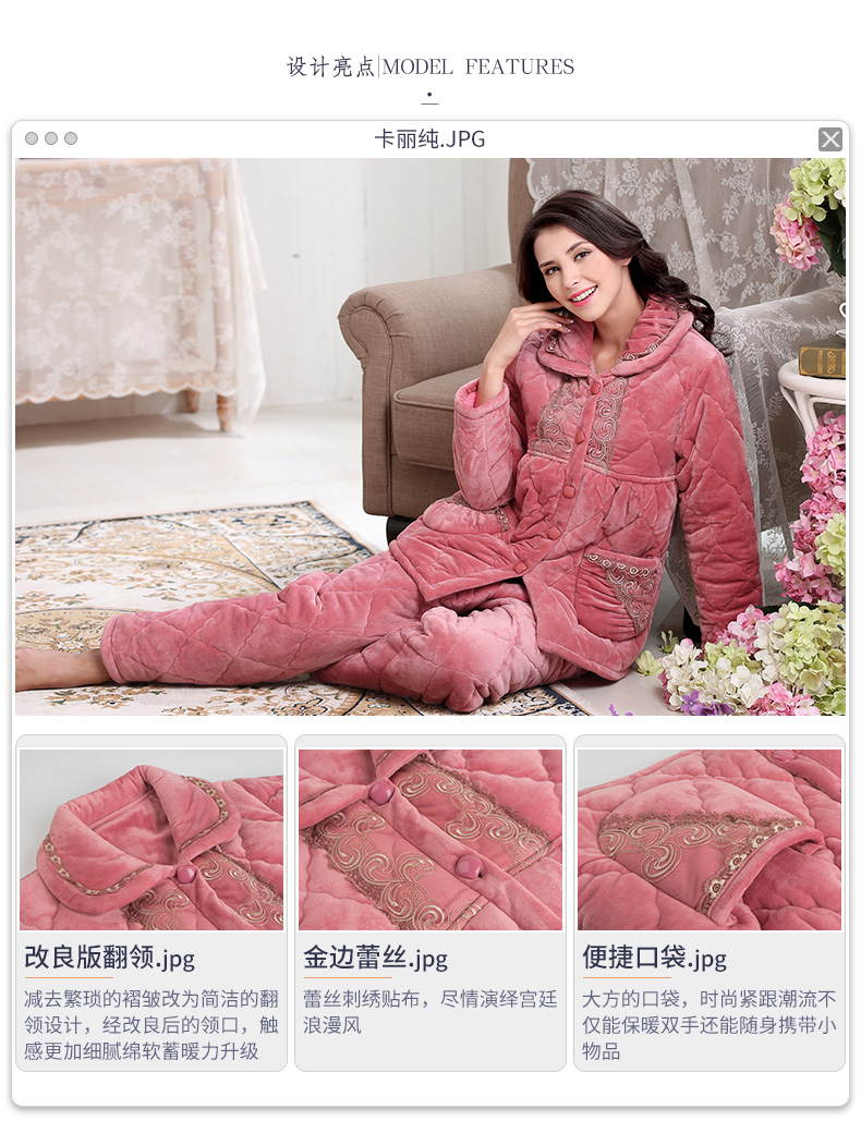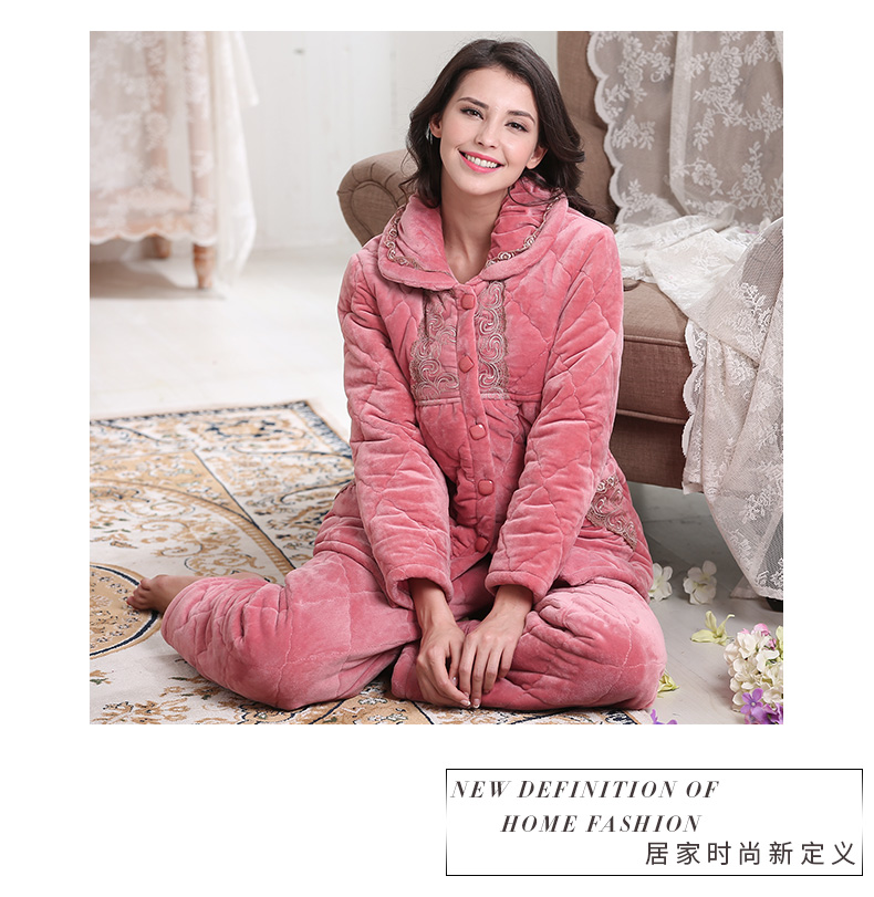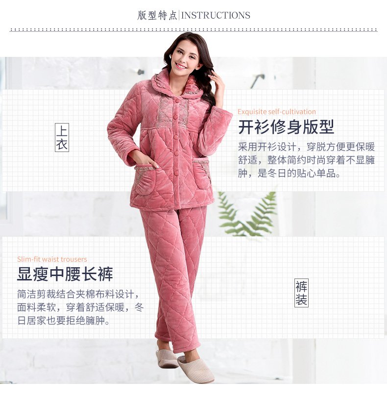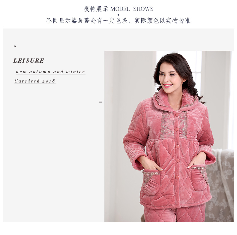 冬季加绒加厚睡衣女冬天珊瑚绒夹棉家居服三层超厚棉袄中老年妈妈