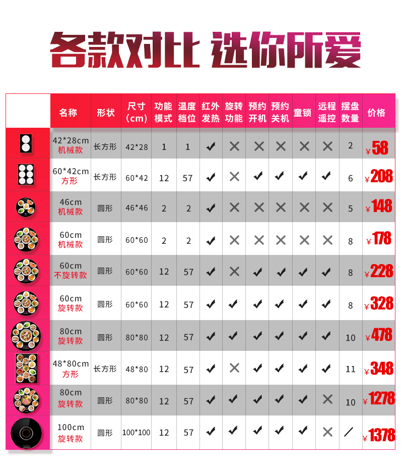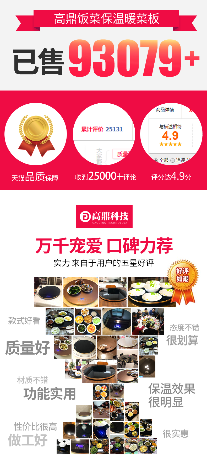 600mm直径圆形暖菜板,预约开机。触控+遥控。360度旋转。3米电源线可放6-8个盘子,家庭实用版,ABS绝缘材质,双开关安全装置,贴心童锁设计,安全放心,