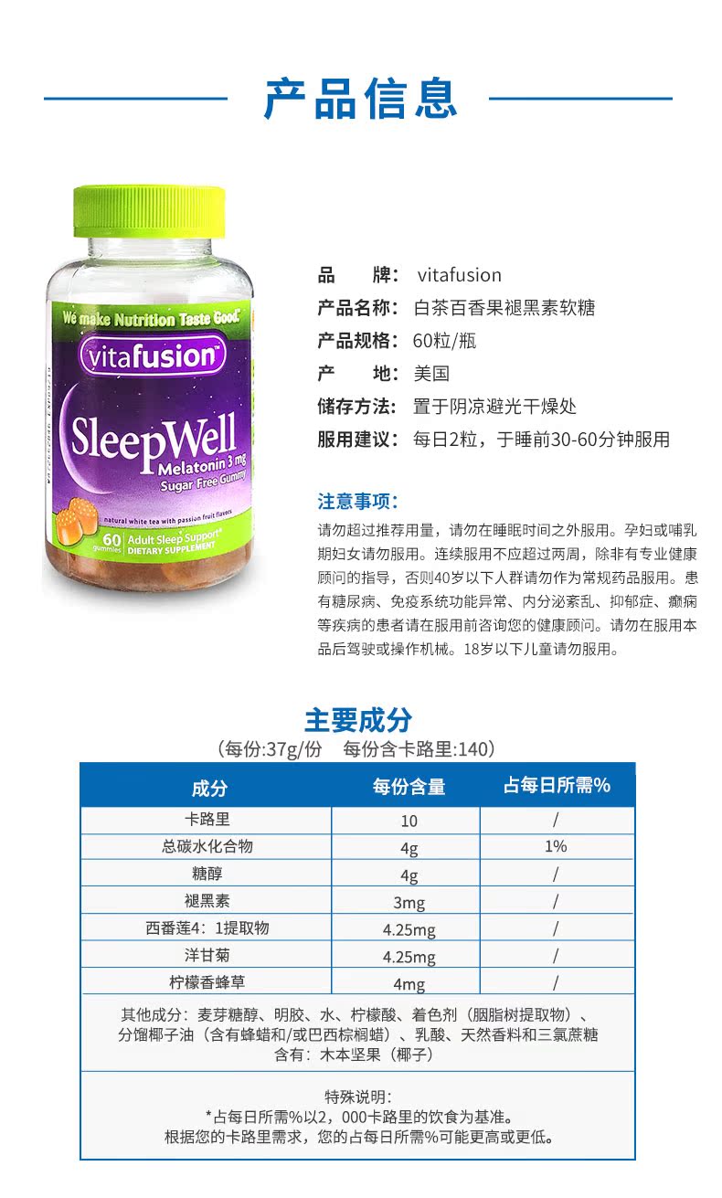 Vitafusion美国进口Sleepwell褪黑素安瓶助眠睡眠软糖60粒