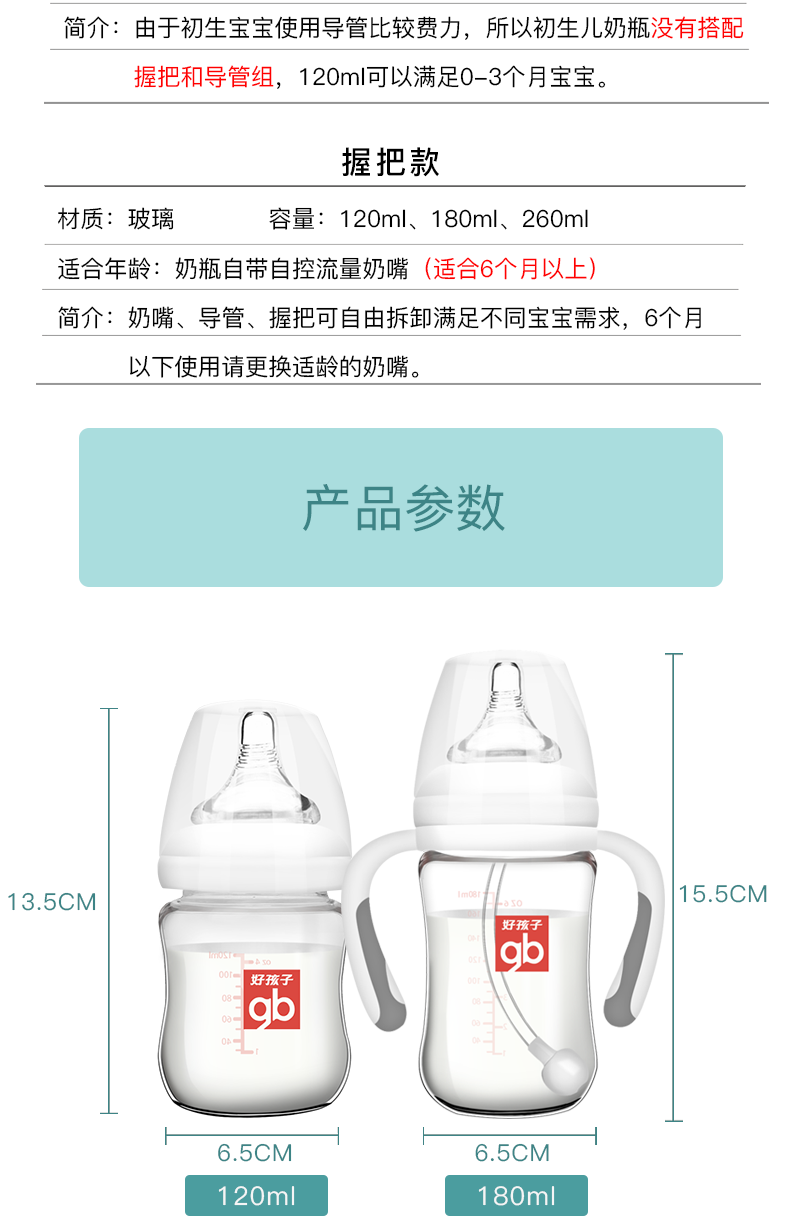 好孩子奶瓶新生婴儿玻璃正品宽口径初生0-6个月防胀气喝水小奶瓶