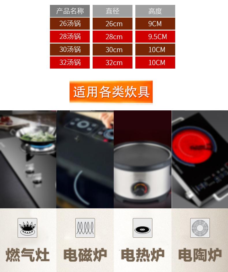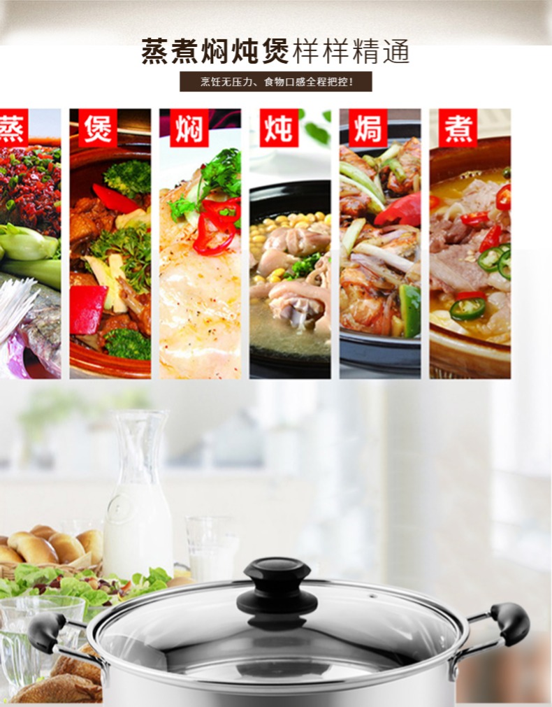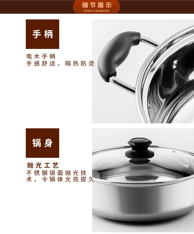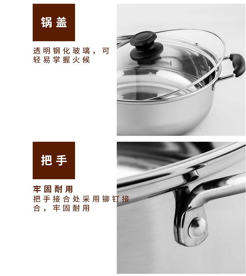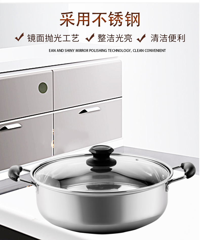 食品级加厚不锈钢材质,防碎防烫玻璃盖;隔热双耳设计,一锅多用,加热速度快,不粘锅内壁,易清洗。