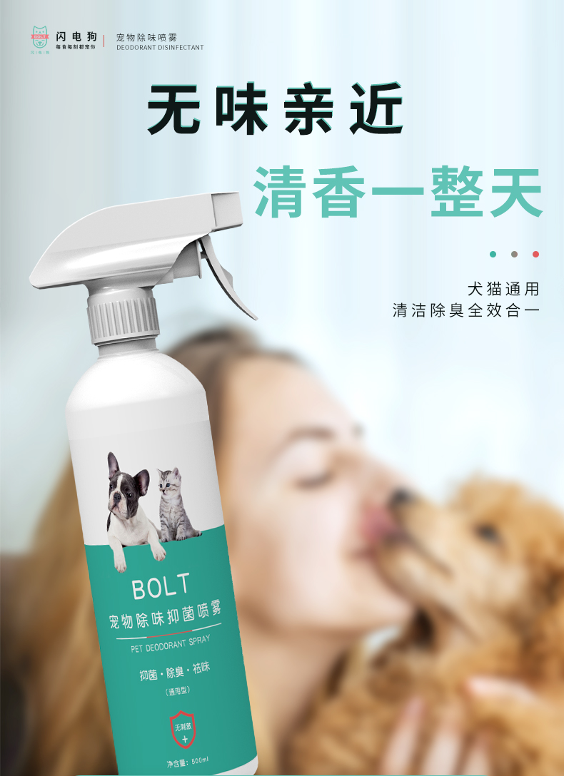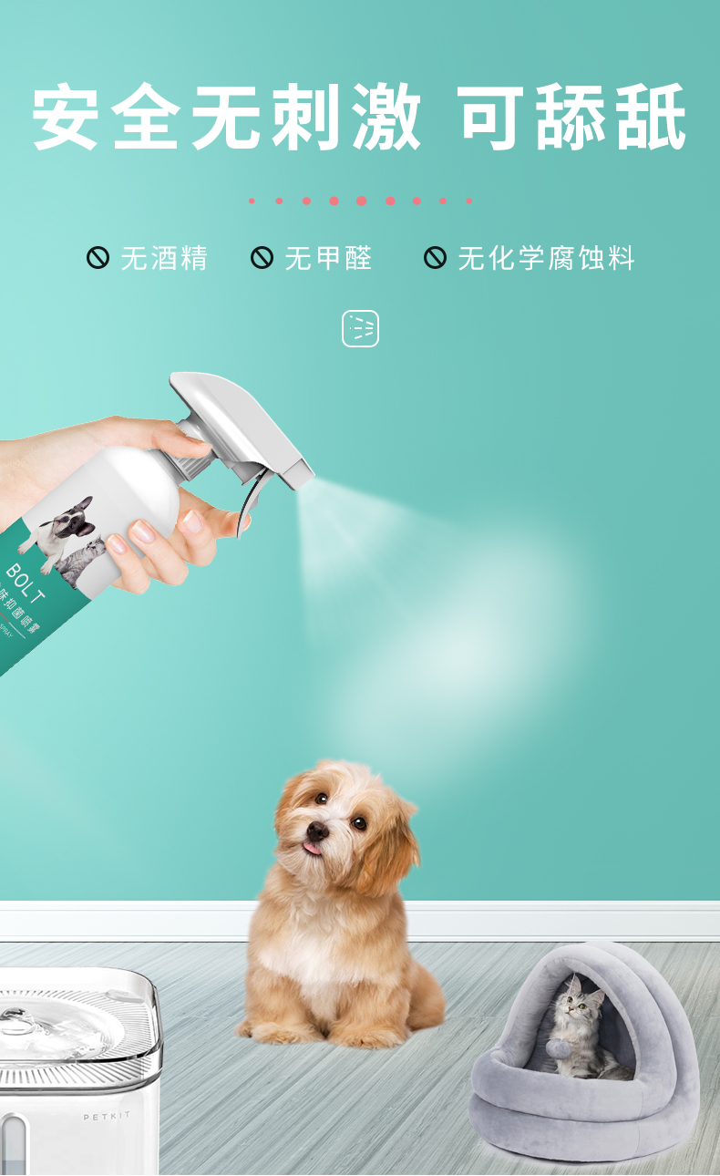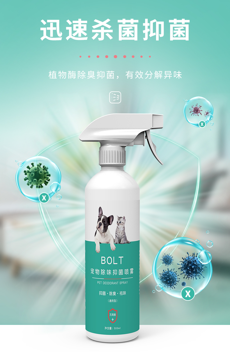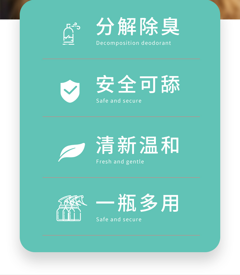 温和型宠物除臭喷雾,安全无毒,一瓶抵多种产品效果,杀菌,抑菌,除臭,三效合一。分解恶臭只需3秒。