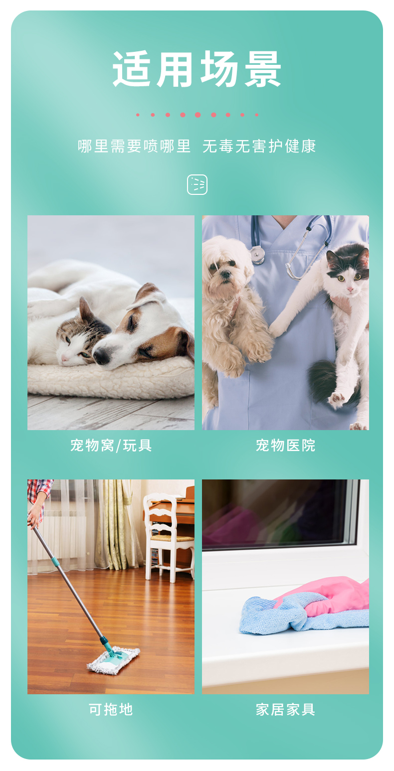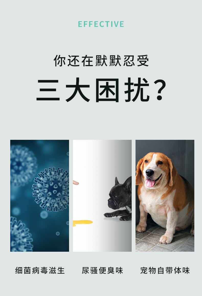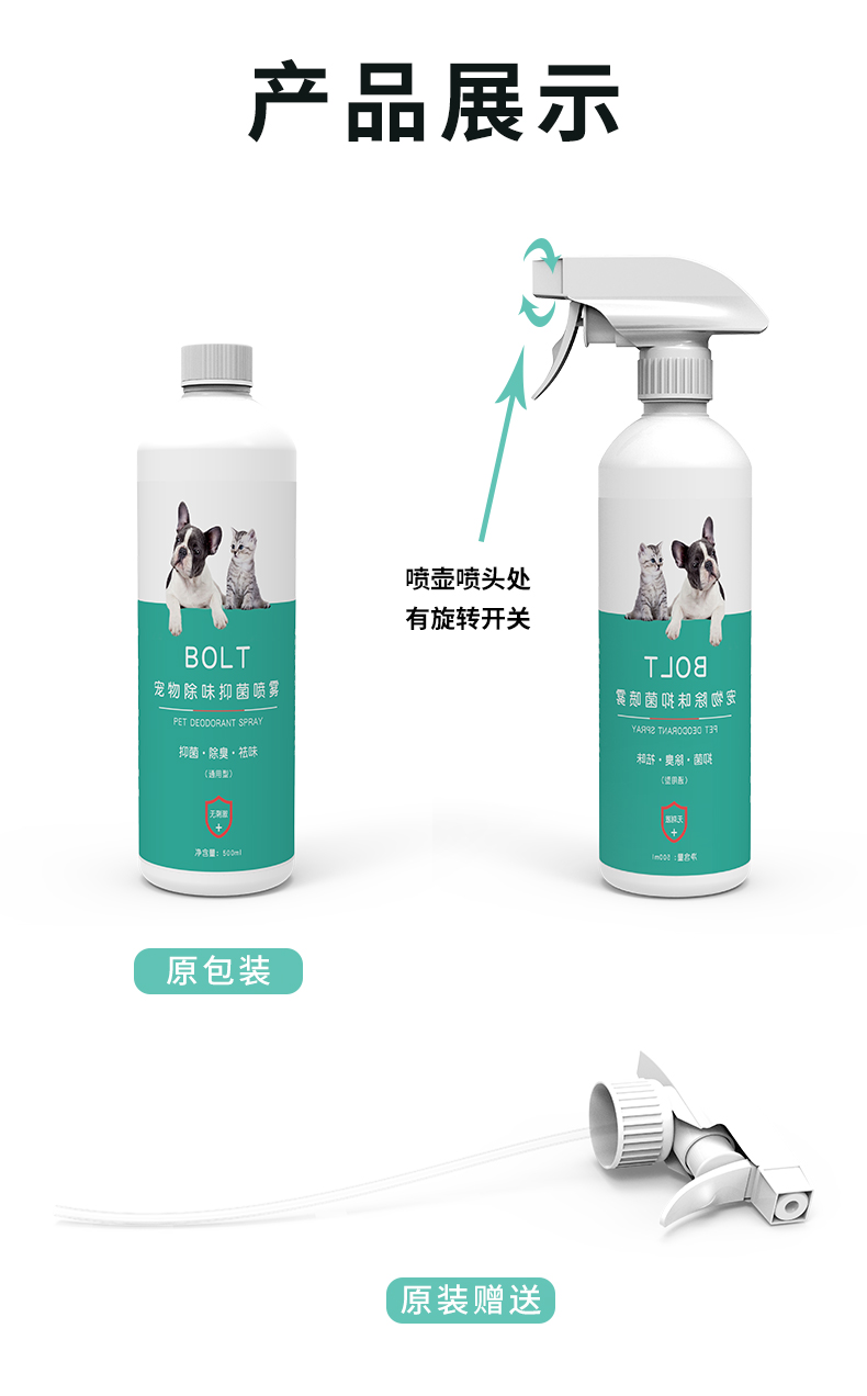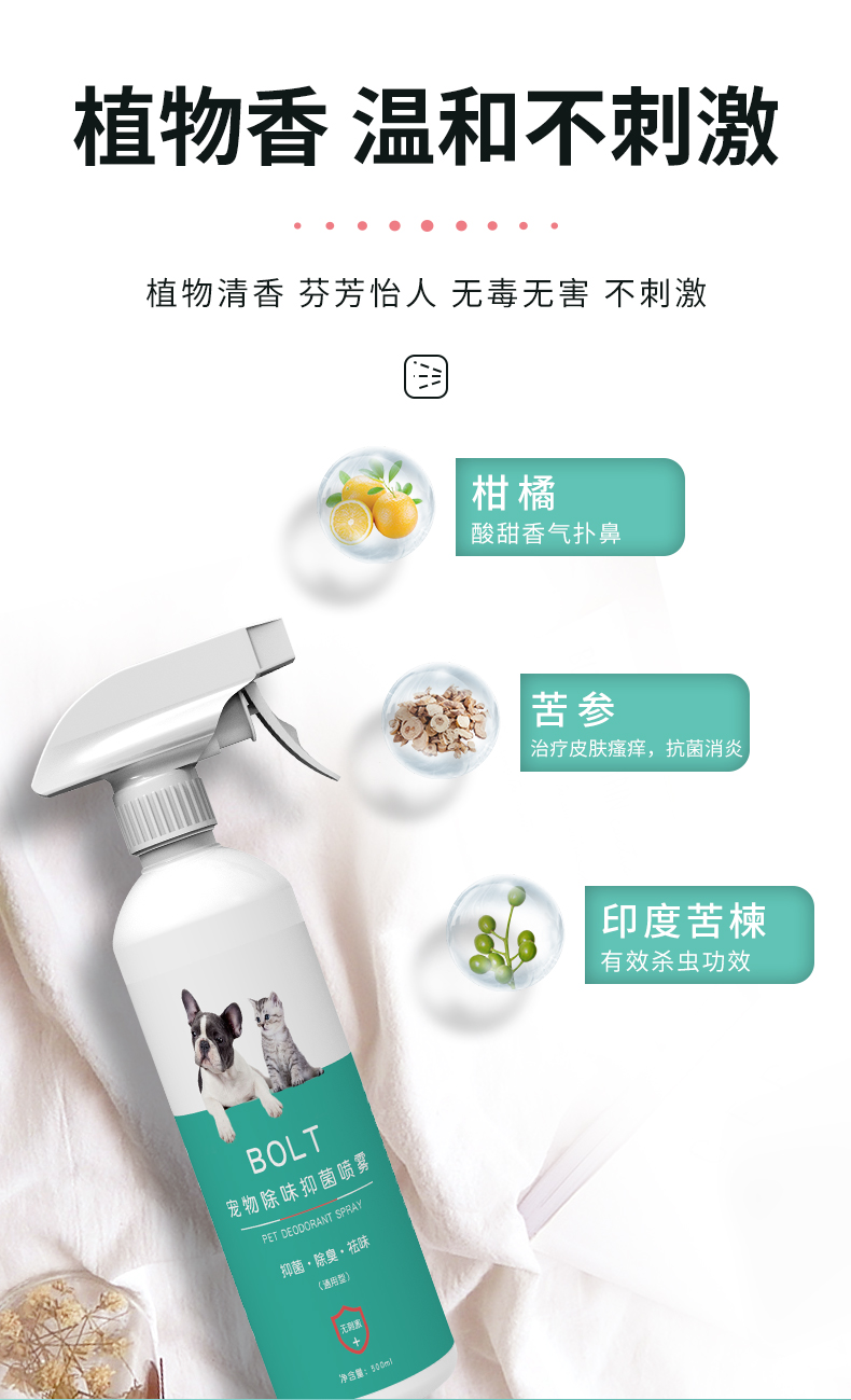温和型宠物除臭喷雾,安全无毒,一瓶抵多种产品效果,杀菌,抑菌,除臭,三效合一。分解恶臭只需3秒。