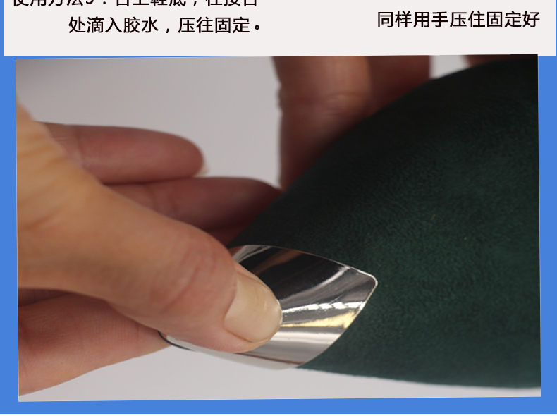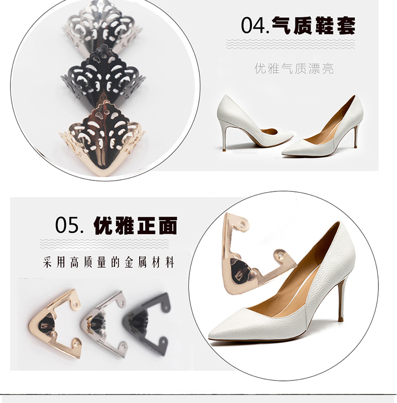 精用优质铁皮制作,高贵耐磨,鞋套光滑外观大方,戴上亮泽漂亮,看起来气质高贵,防踢修复多用,使用简单,值得拥有。