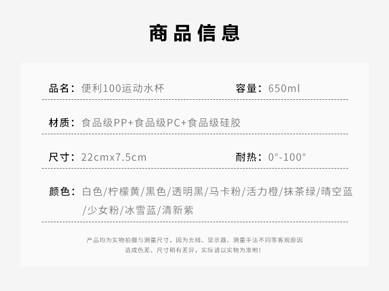 大容量,食品级pp材质,卫生安全,健康无毒,外观创意有个性,手感舒适,小巧便携,密封不漏水,多种颜色可以选择!运动爱好者必备之选!【赠运费险】