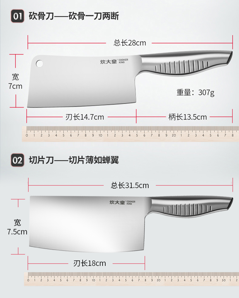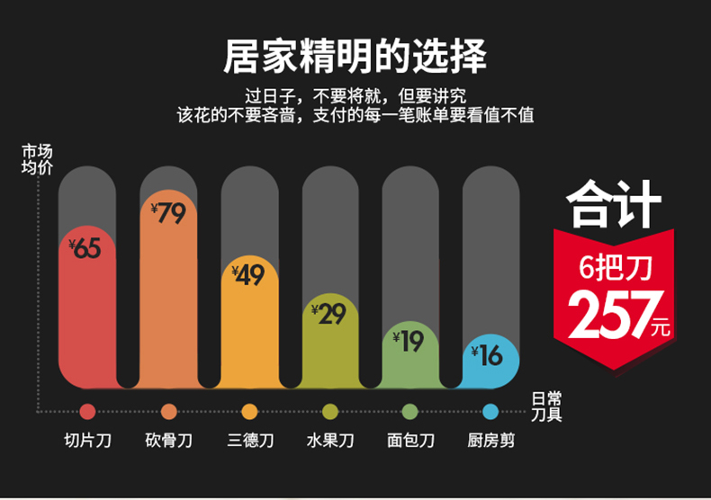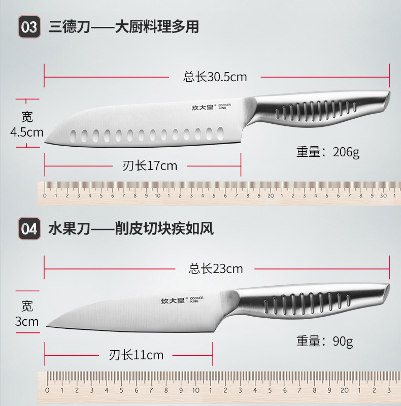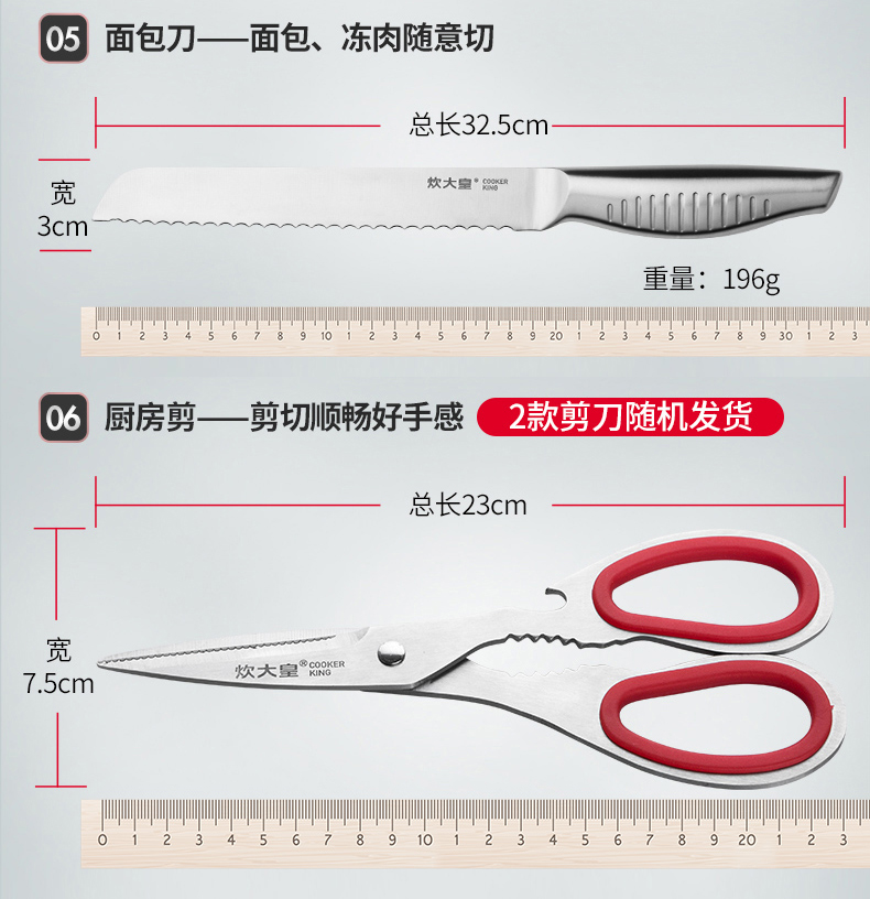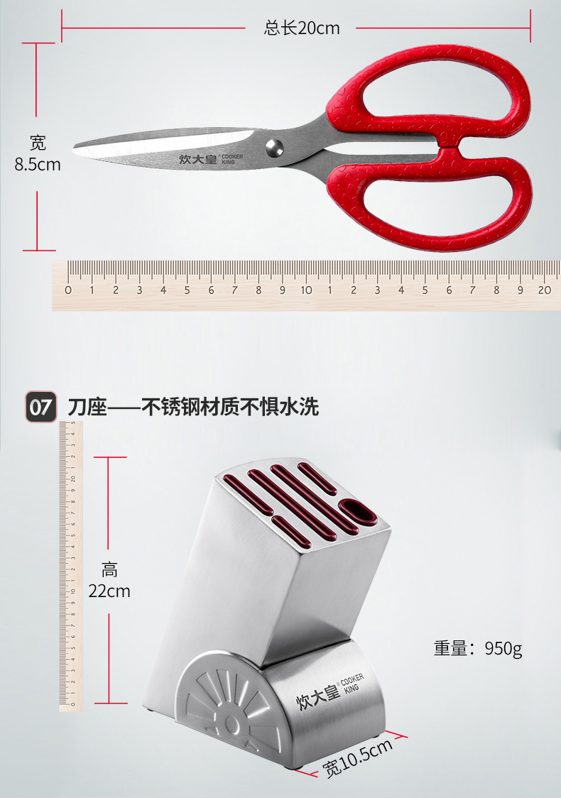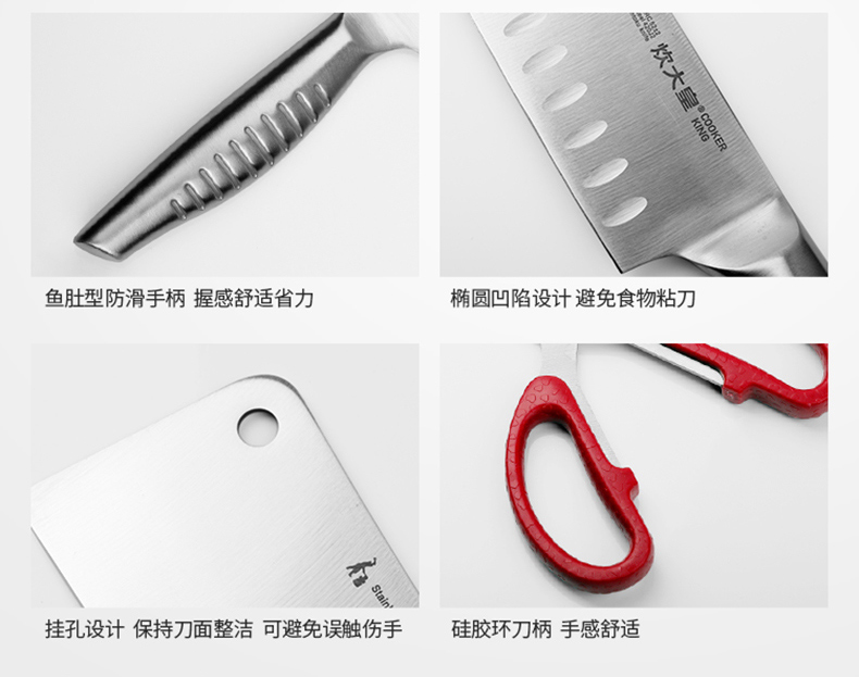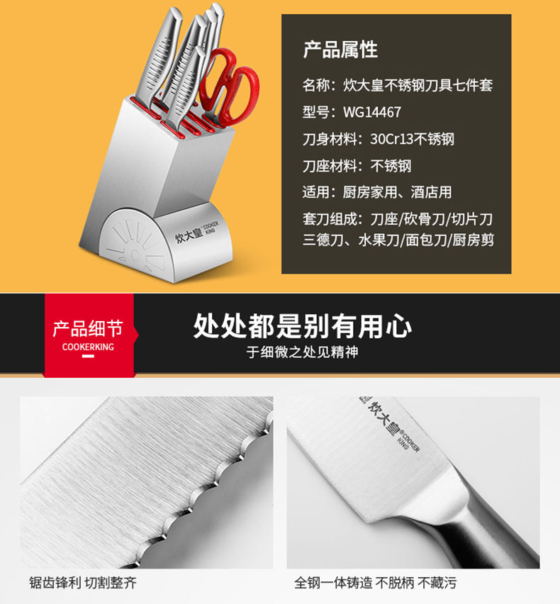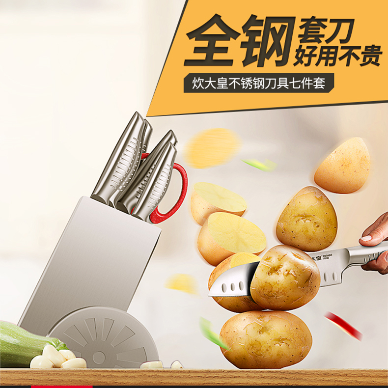 炊大皇不锈钢刀具七件套,结构紧密稳定,耐磨抗腐蚀,经久耐用,全钢套刀,好用不贵。过日子不要将就,但要讲究,选择你所信赖的!