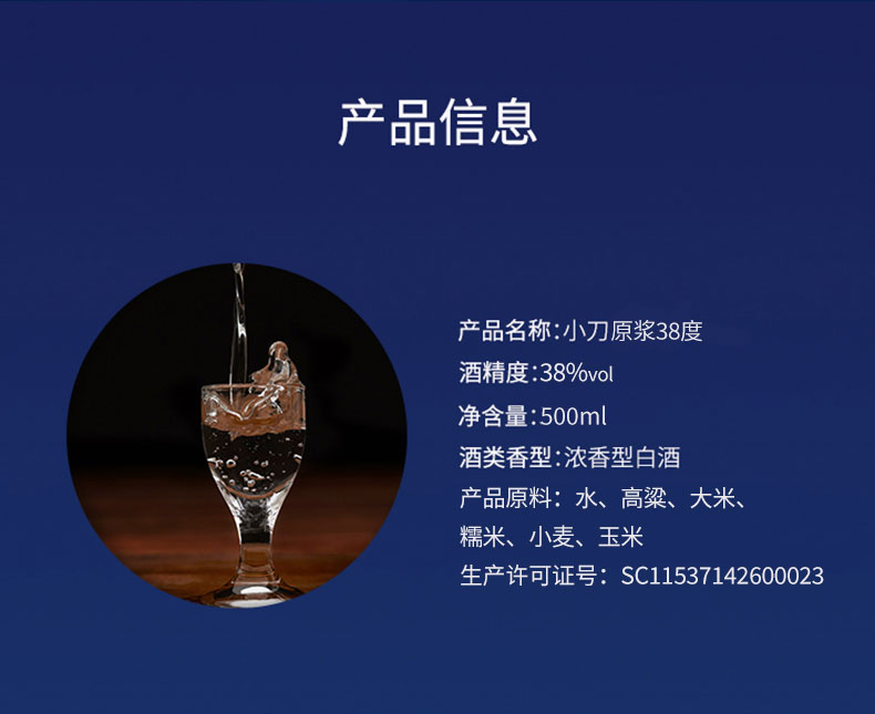 38度,500ml单瓶装,五粮酿造,低温提醇,口感绵柔,入口爽净。