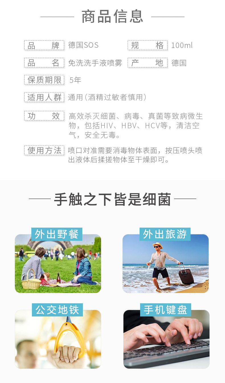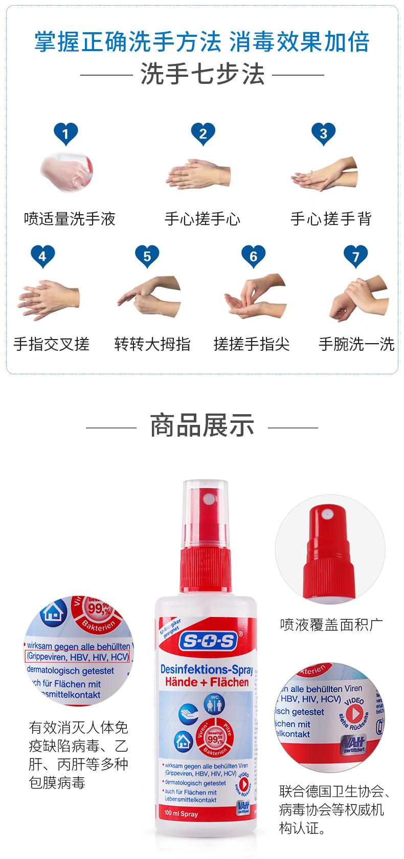 德国SOS儿童宝宝免洗洗手液家用小瓶便携式杀菌消毒抑菌喷雾100ml