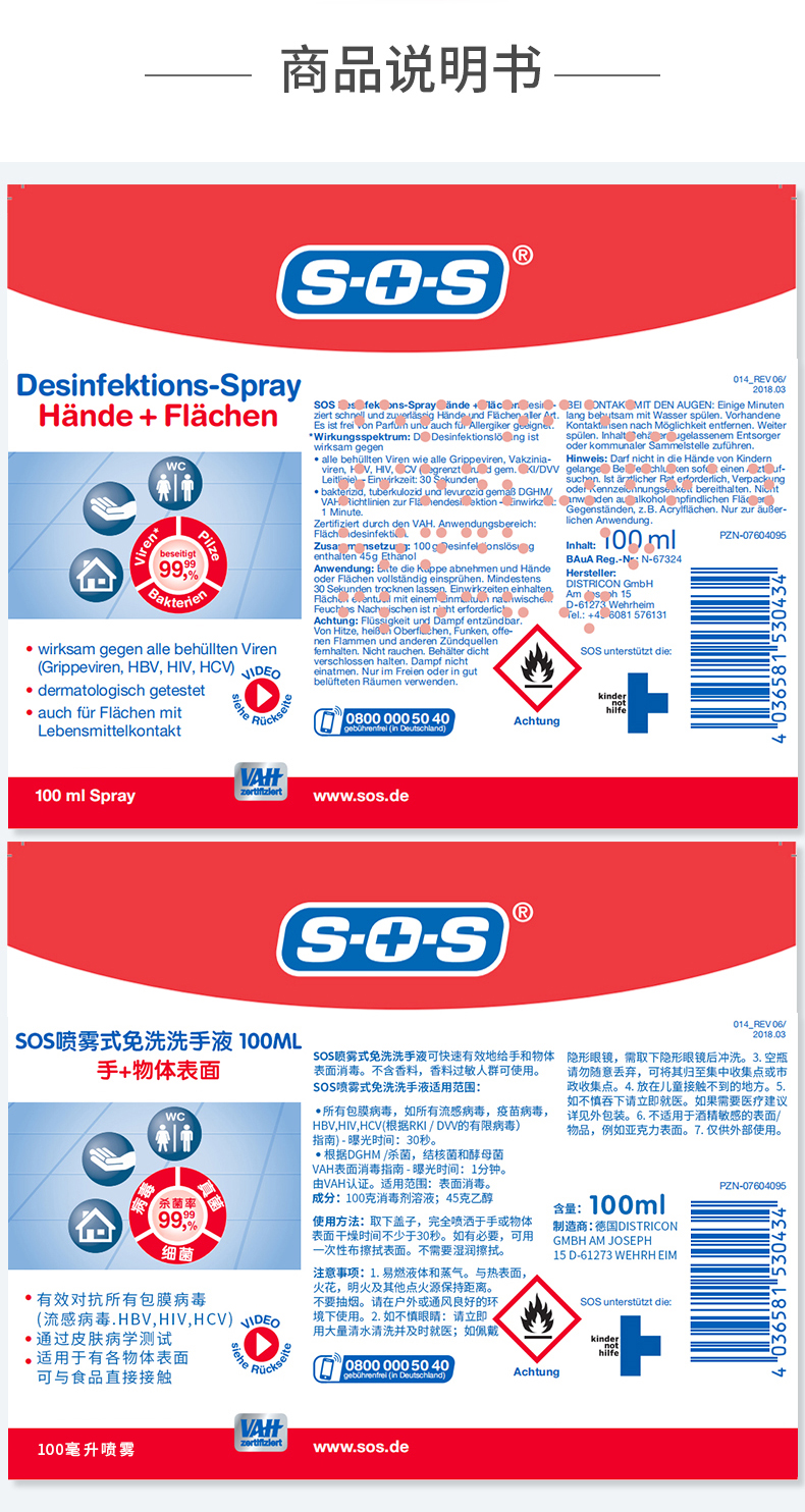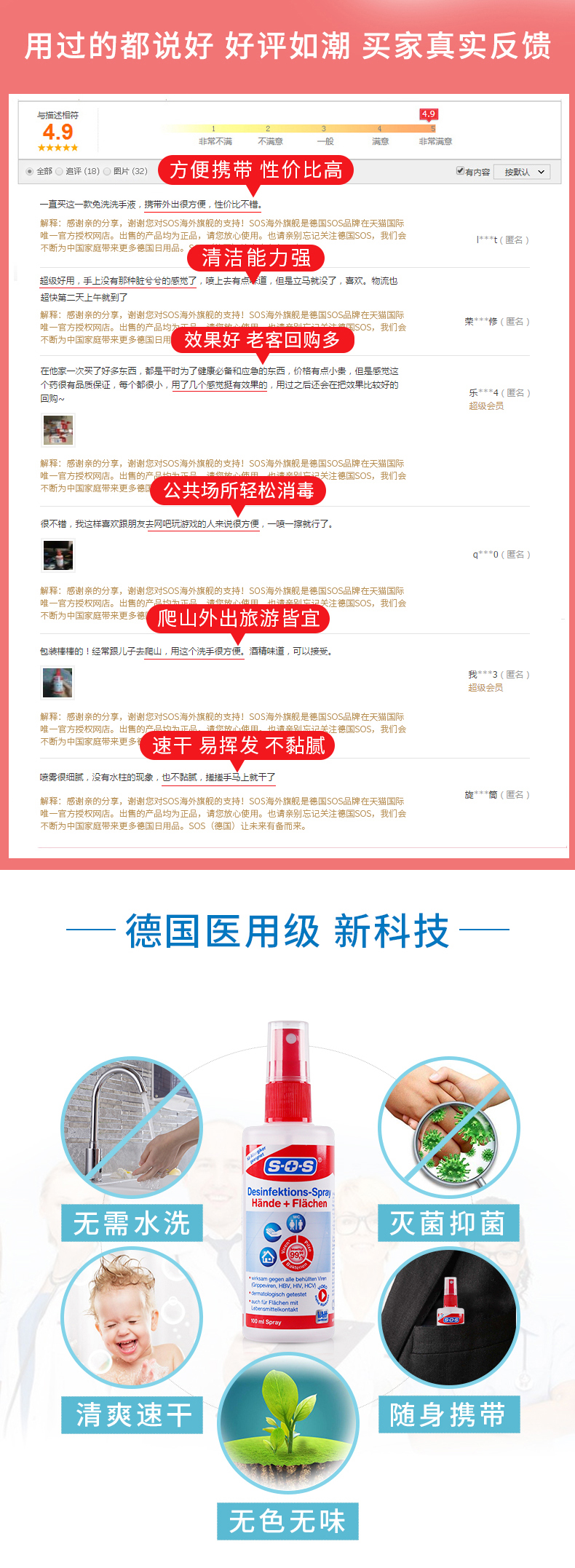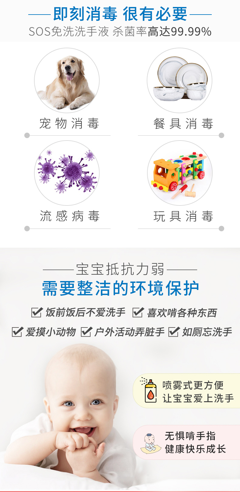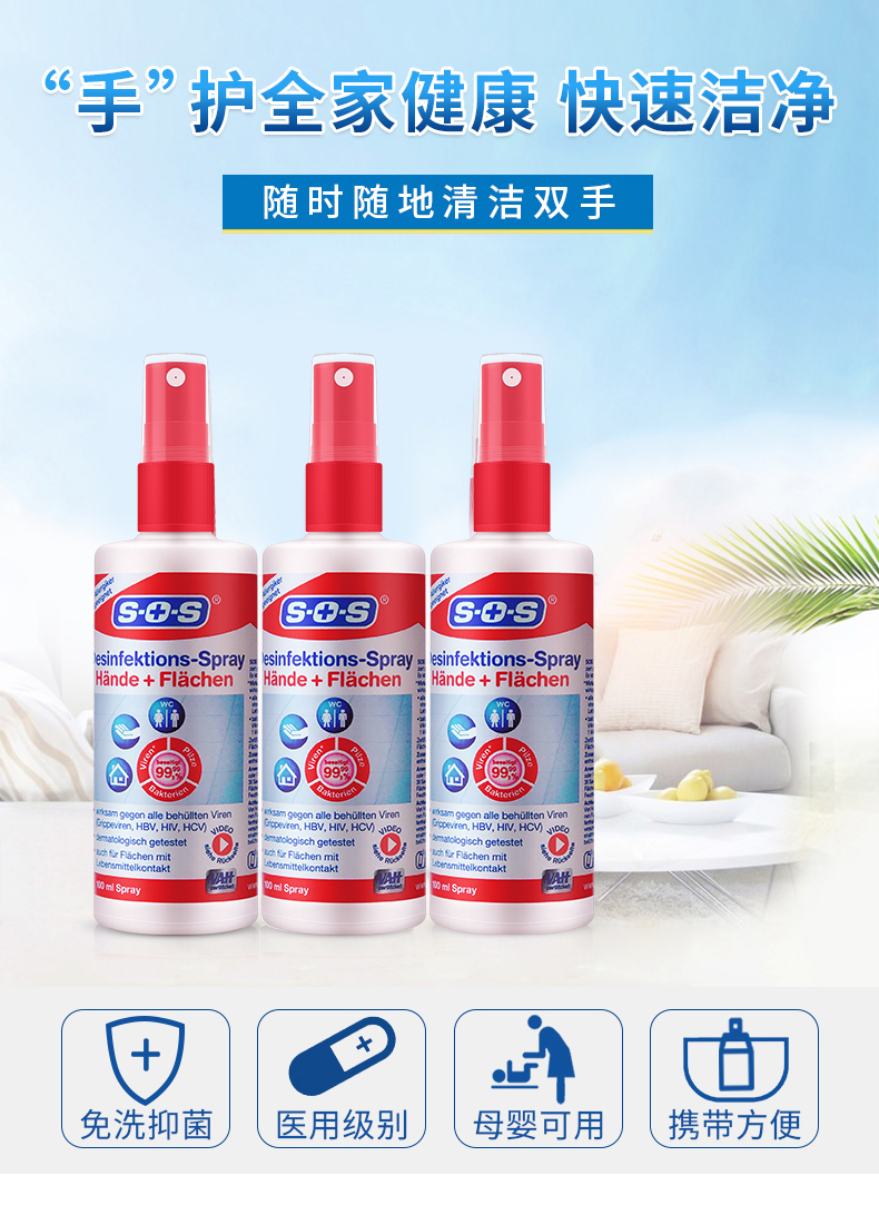 SOS是德国国民药妆品牌,高效杀灭细菌、病菌、真菌等致病微生物,安全无毒,杀菌率高;除了给宝宝消毒使用,还可用于宠物、玩具等。