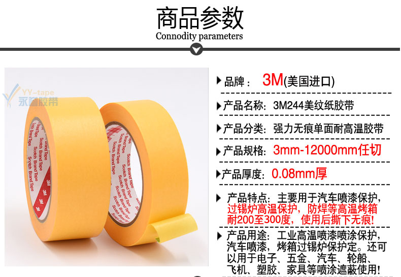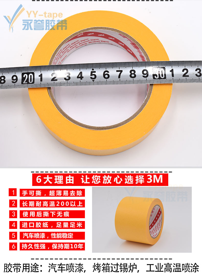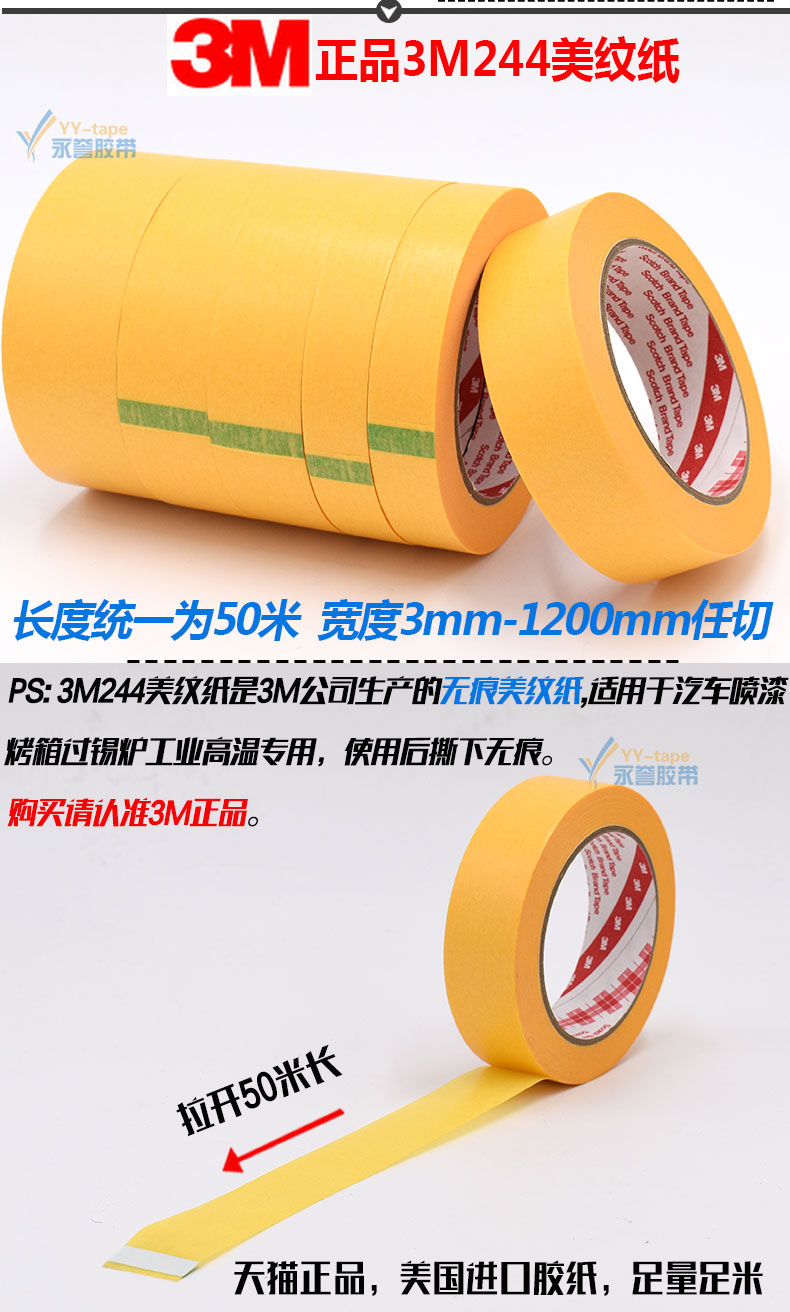 3M244美纹纸胶带,原装正品,汽车喷涂遮蔽无痕耐高温黄色和纸胶带,烤炉波峰焊模型遮盖船舶分色喷漆保护美纹纸,喷漆耐200度撕下无痕稳定性强!