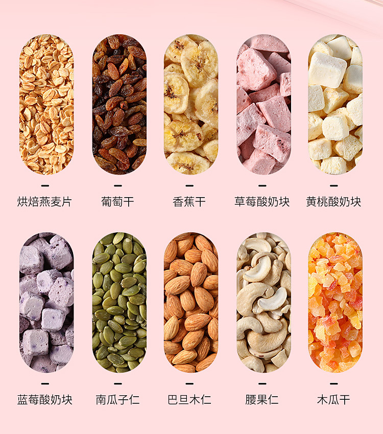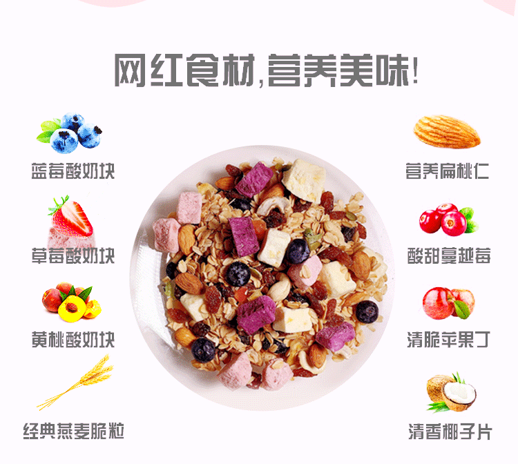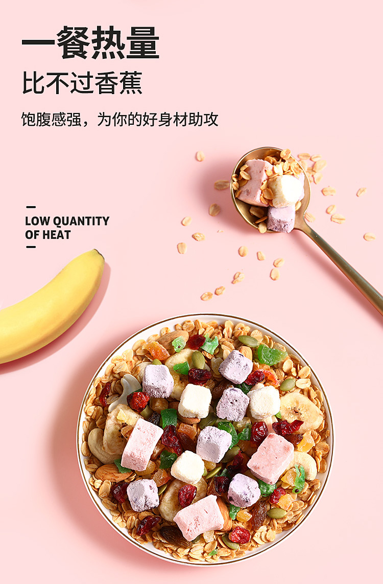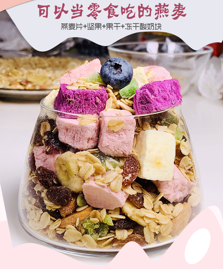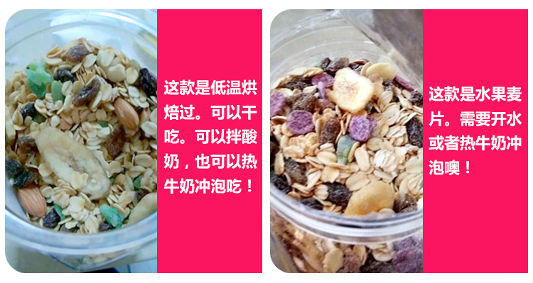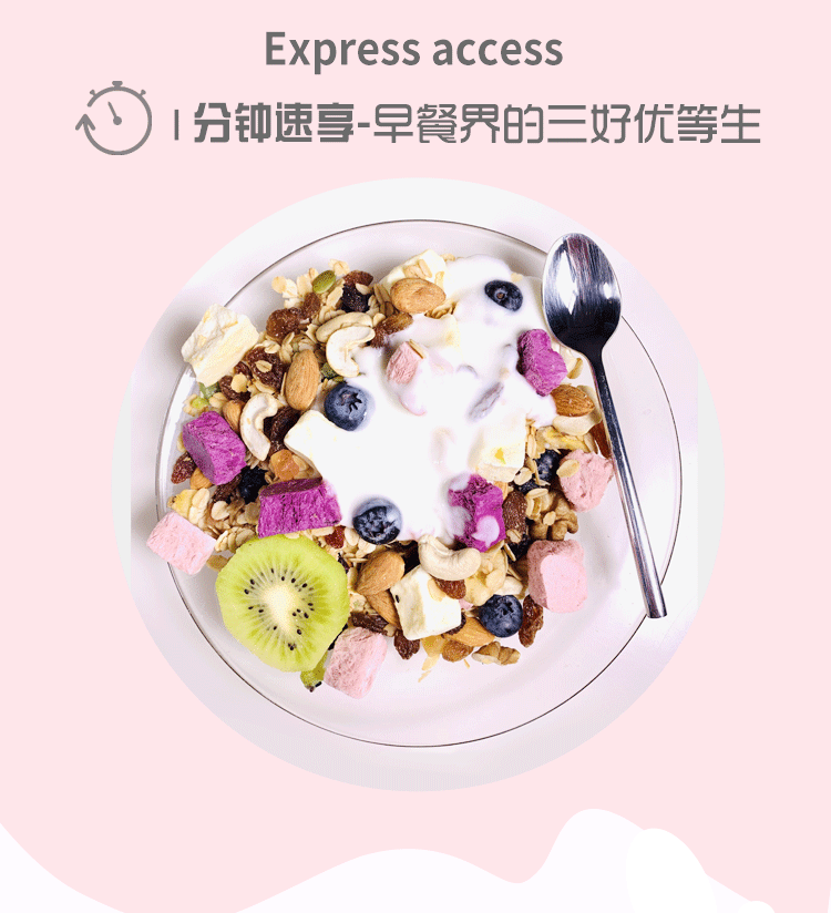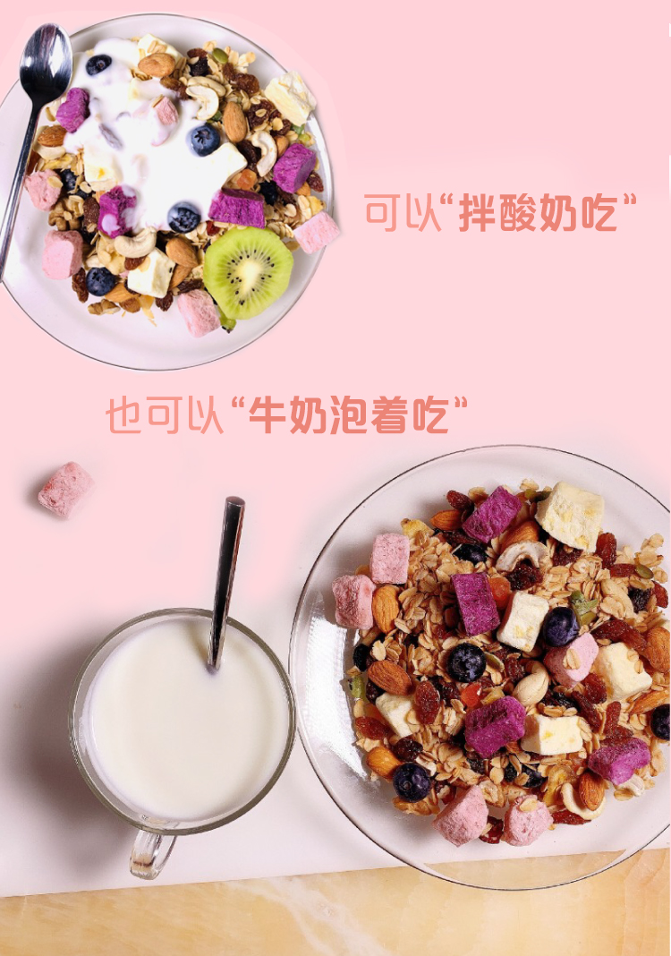 即食冲饮谷物,搭配缤纷果干,口感香甜,营养丰富!