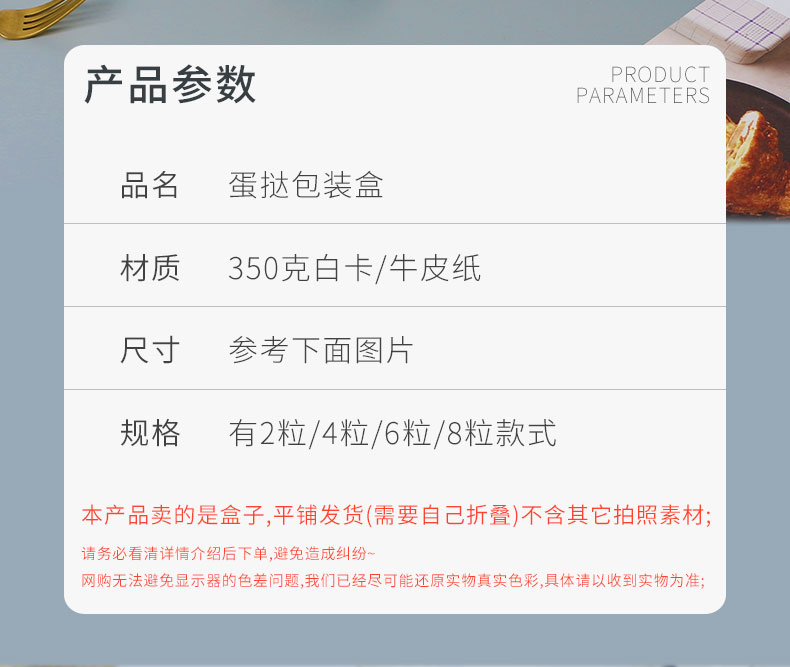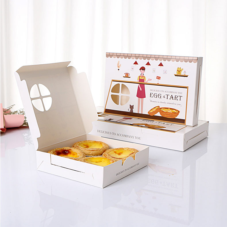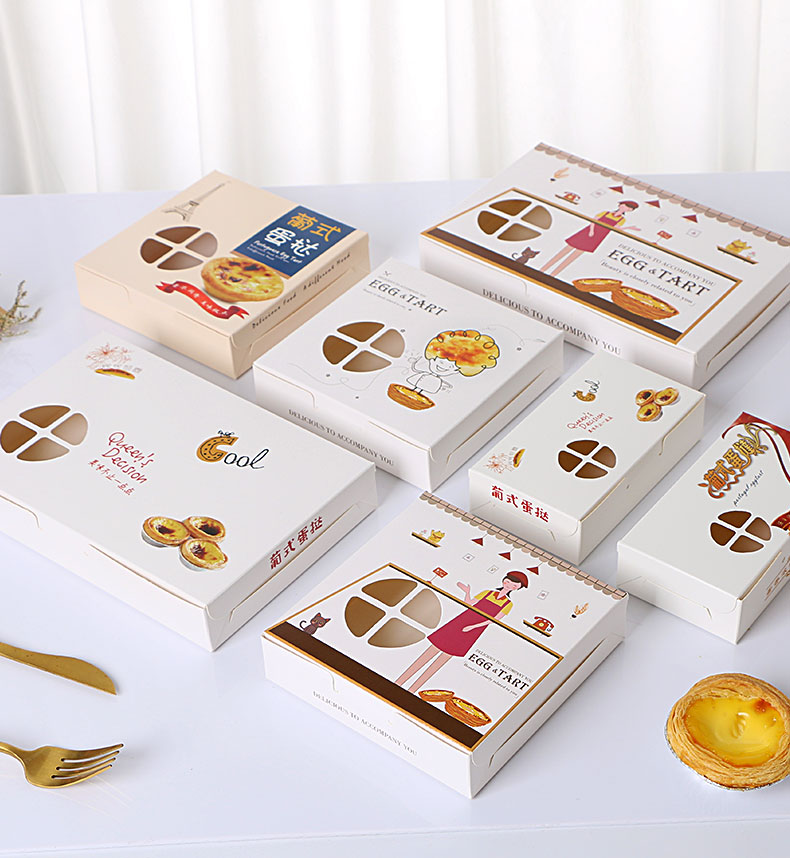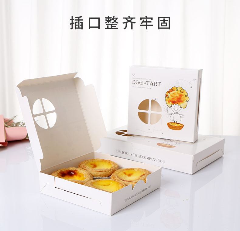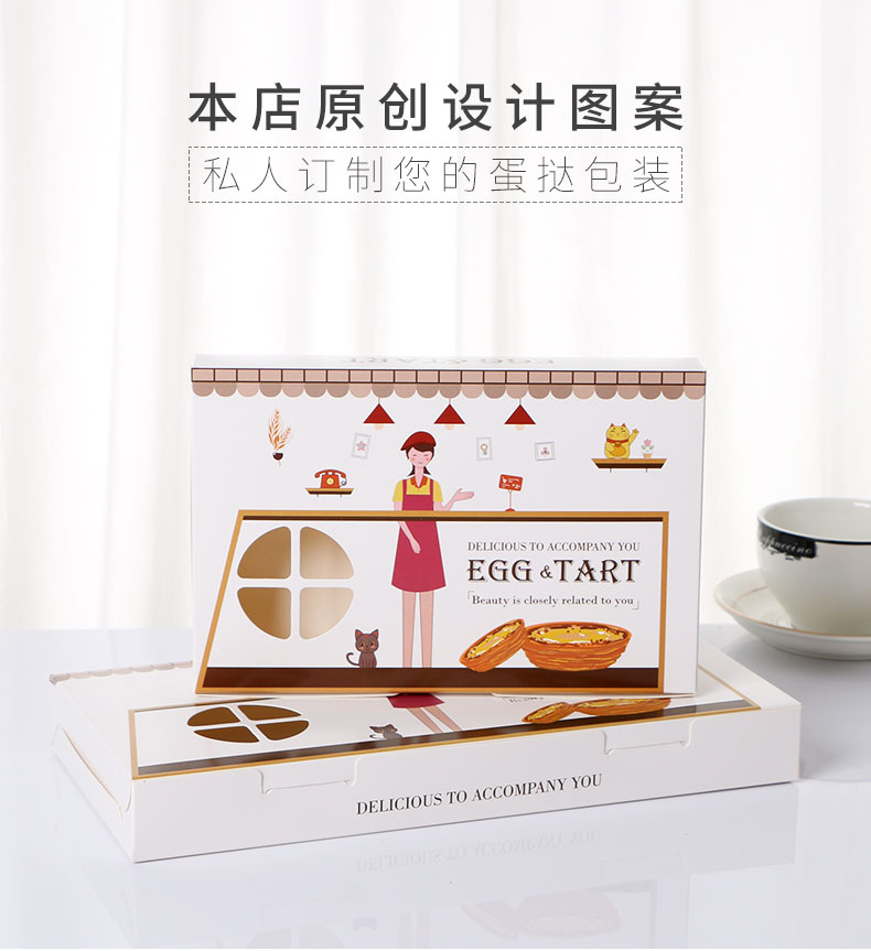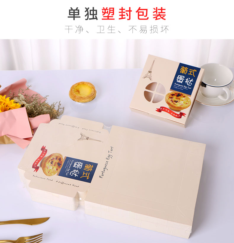 环保油墨印刷,无毒无味,350克厚食品级白卡,安全卫生,缕空开窗设计,镂空不仅美观还可当散热孔,不用担心刚出炉的蛋挞不能装盒,