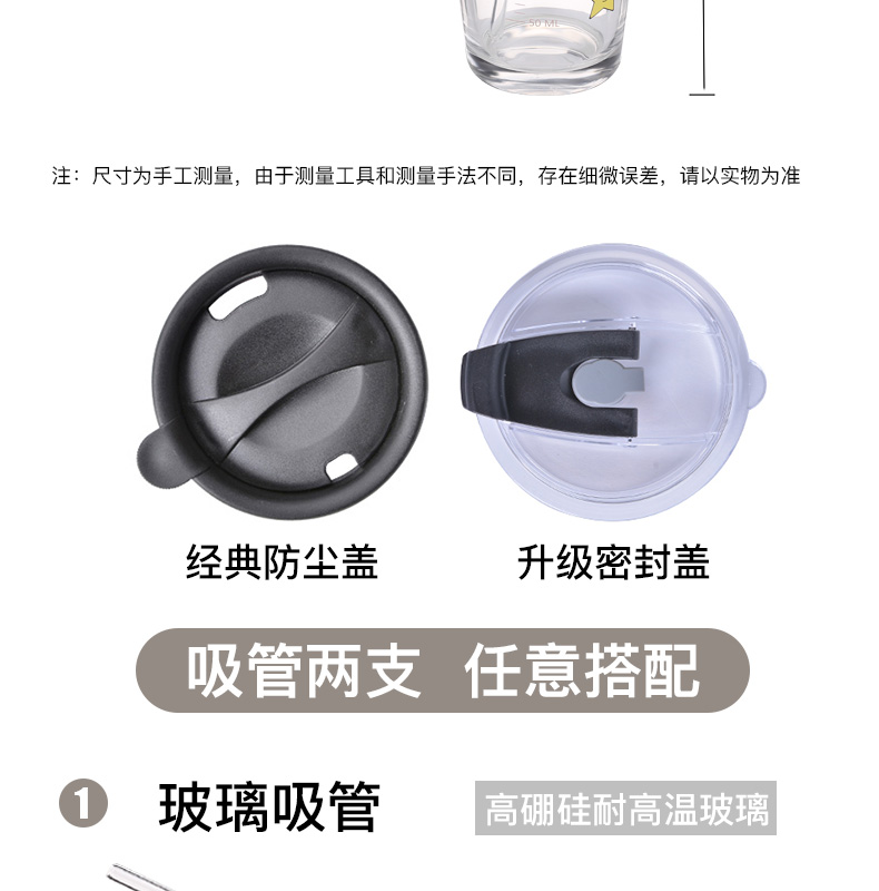 多款可选,防漏水吸管玻璃杯,内置环保硅胶塞,贴心设计,一杯多用,喝水孔与吸管孔可独立打开或闭合,搭配吸管喝水更方便,自带刻度,精准把控,精致的你必须来一个!