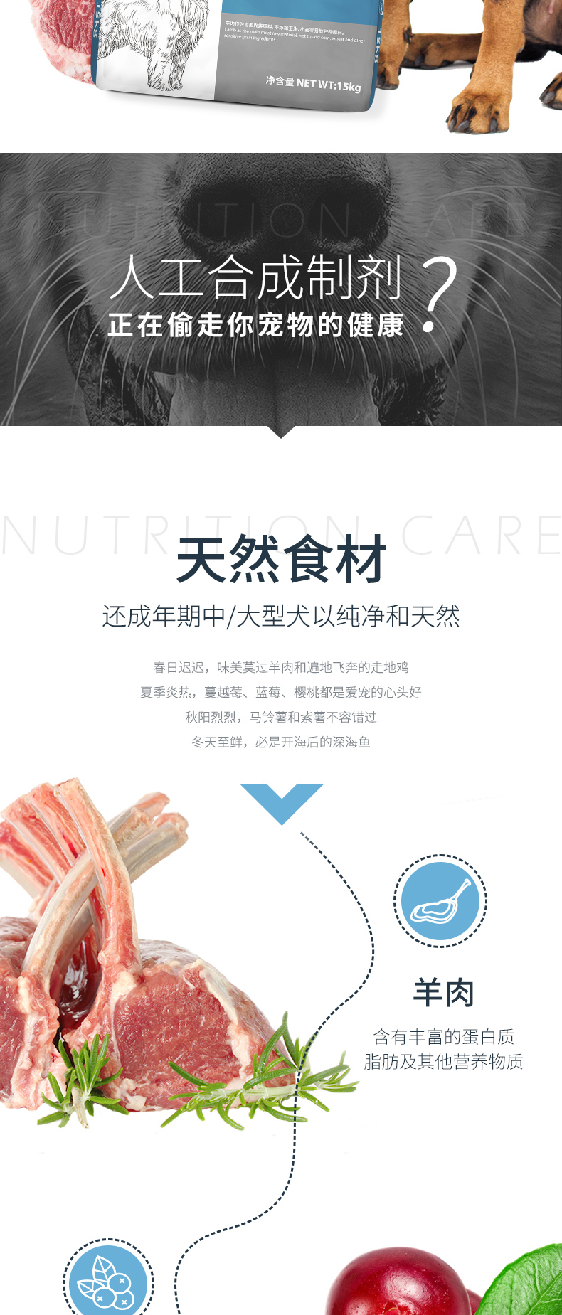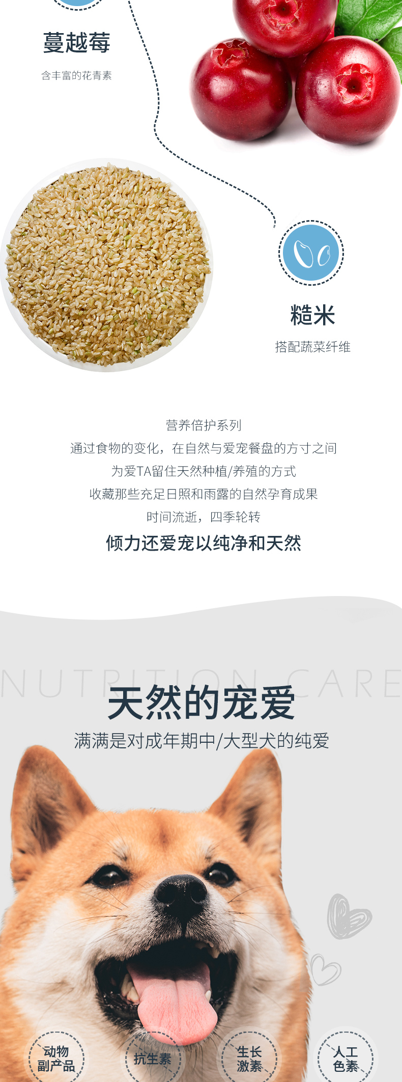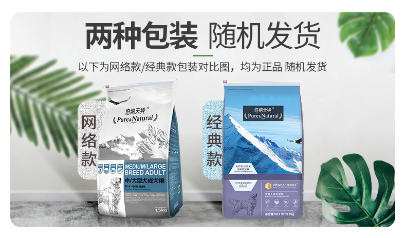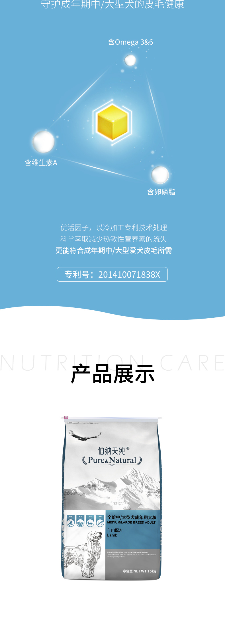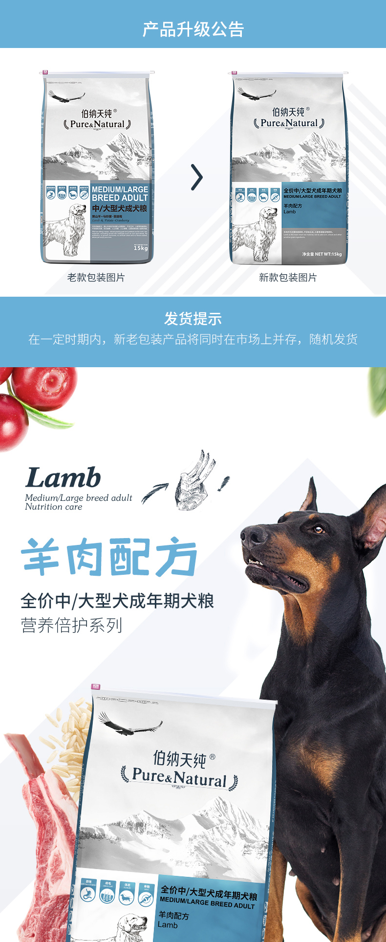 【买套餐即赠超多礼品】伯纳天纯中型大型成犬狗粮15KG,肉类+果蔬+草本配方,金毛法斗萨摩通用型犬粮,无谷天然,低敏健康