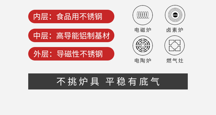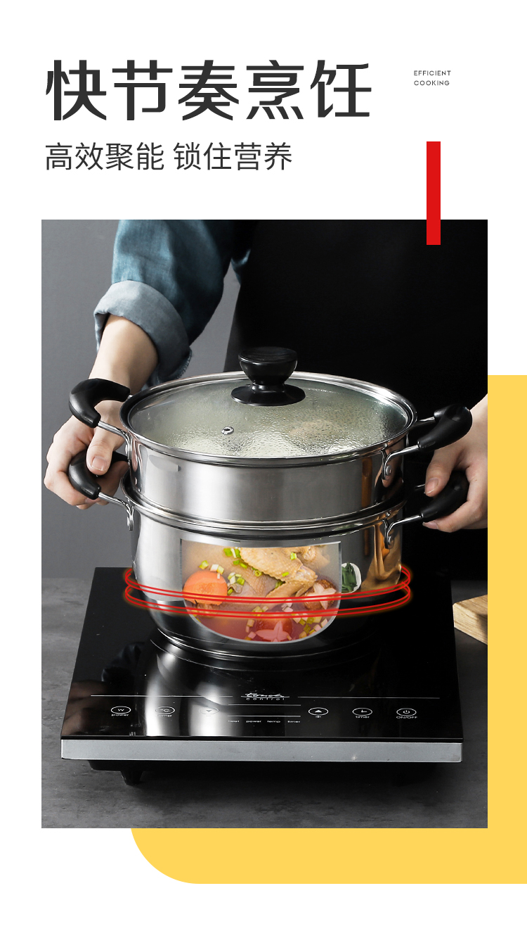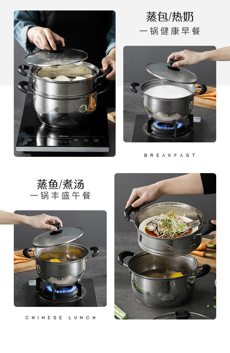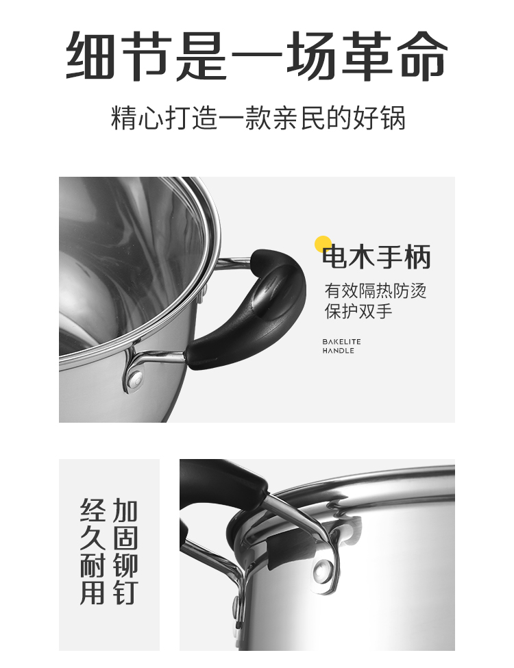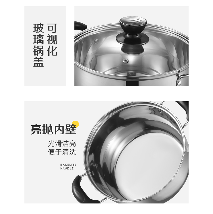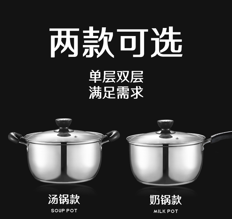 加厚不锈钢材质,坚固耐用,电磁炉燃气灶都可用!防烫手柄,安全放心,易清洗,经久耐用!