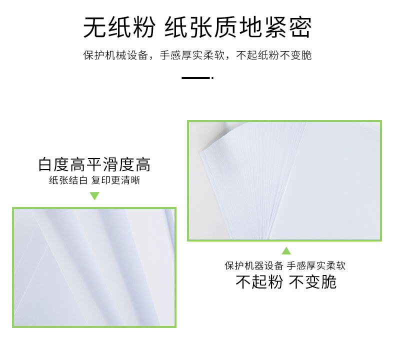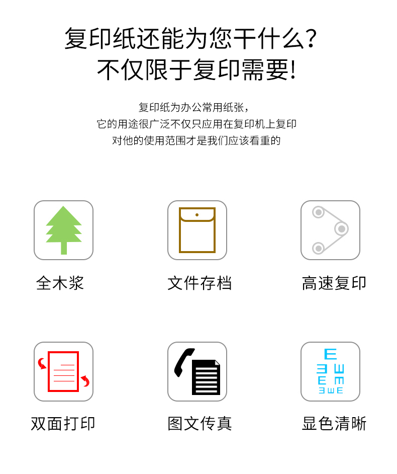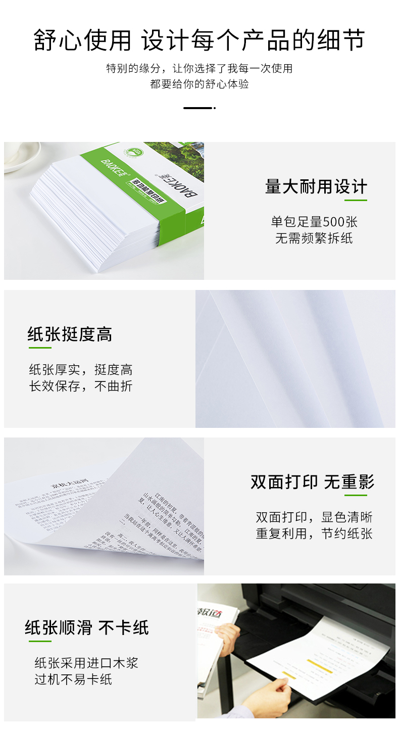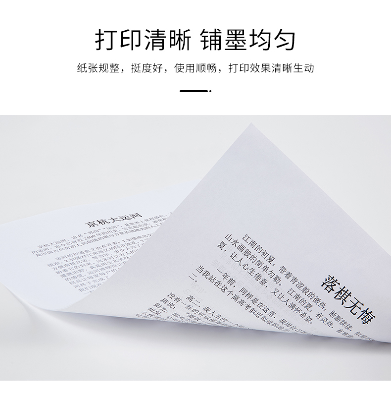 多功能复印纸,显示清晰,触感丝滑,高速复印,全木浆纸,吸水性强,强韧性好,耐折度高,不易掉粉墨,书写流畅,不易渗墨,一纸多应用