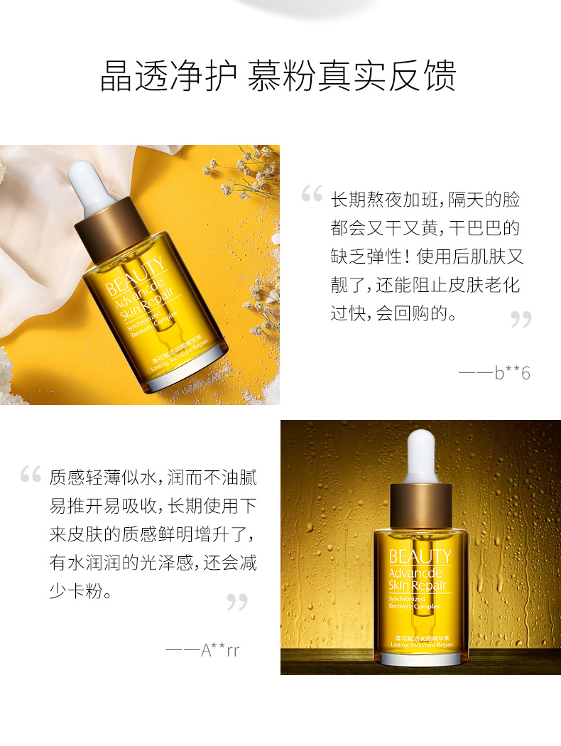 一定要拍5件,5件到手仅29.9!肌肤暗沉粗糙?用莲花修复精华液!含莲花提取物,温和滋润肌底,去细纹,抗老化,清爽易吸收,让你重回年轻滑嫩肌!