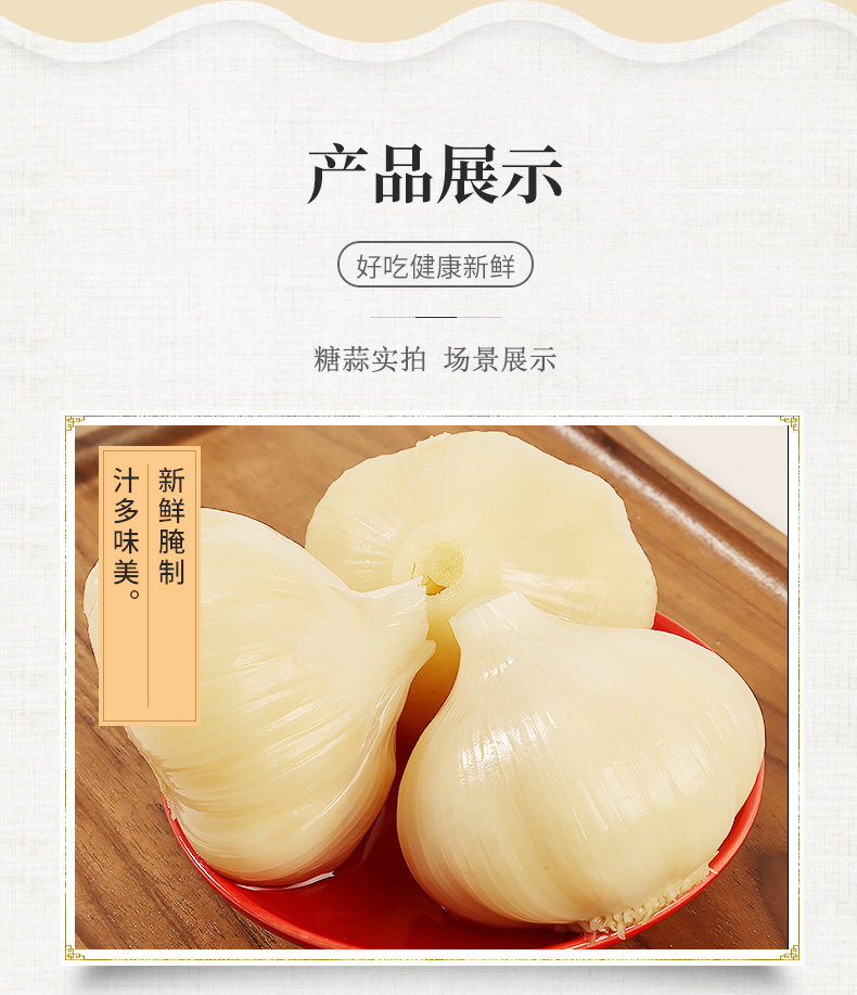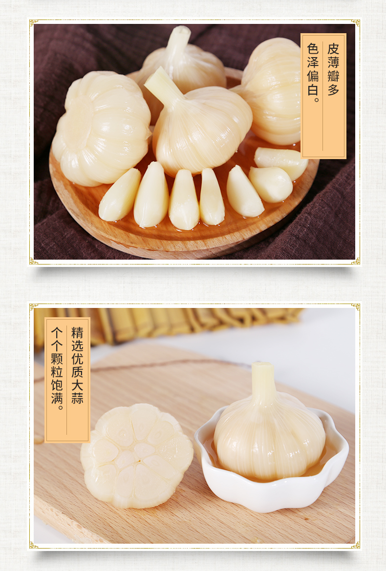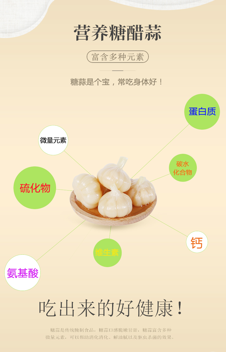 蒜是个宝,常吃身体好!富含多种营养物质,精选颗粒均匀,个头大,皮薄肉厚的新鲜大蒜腌制,口感脆脆的,酸甜可口!开胃爽口,您的下饭好伴侣!