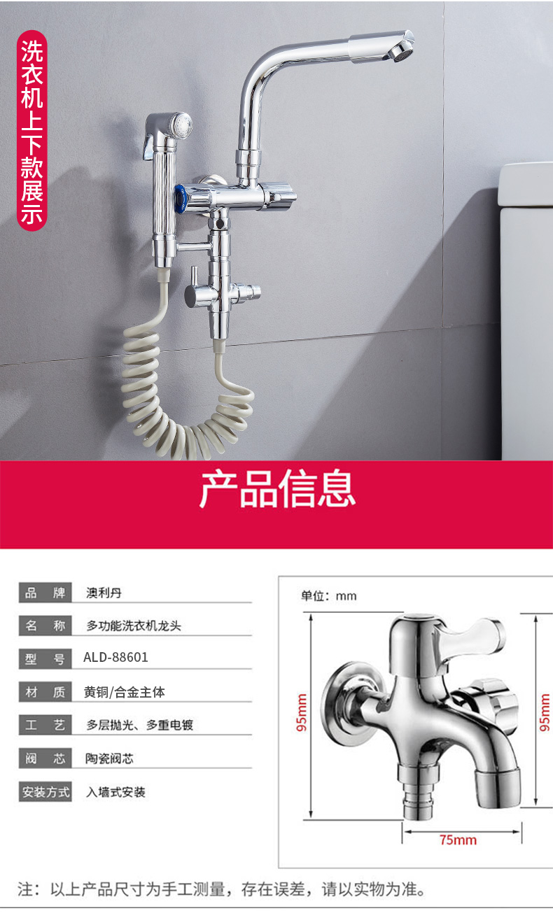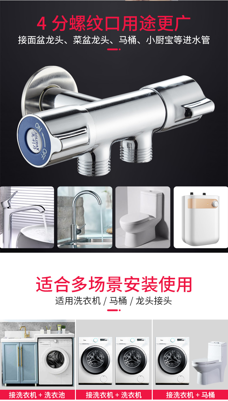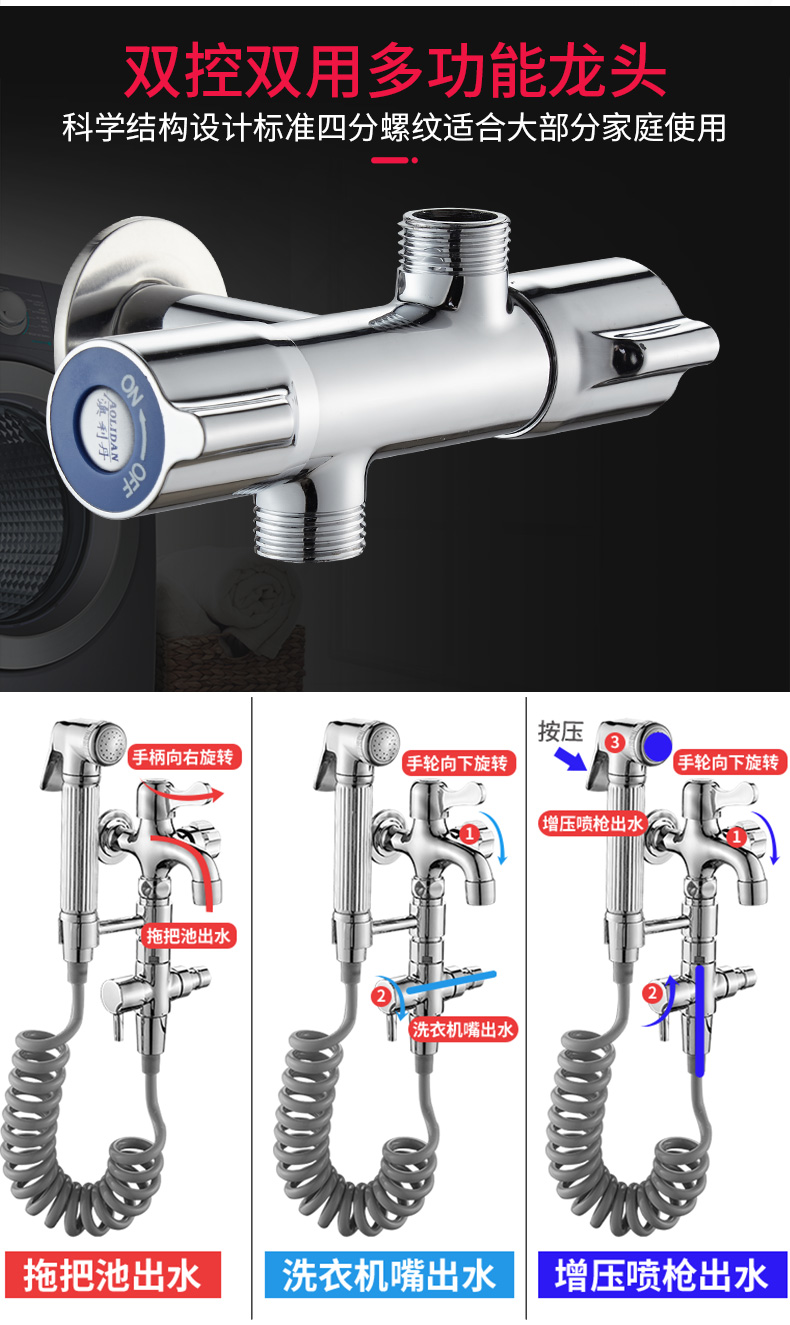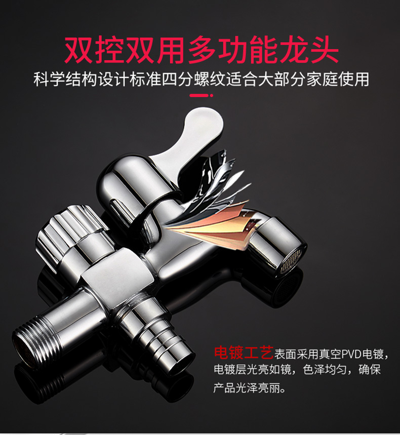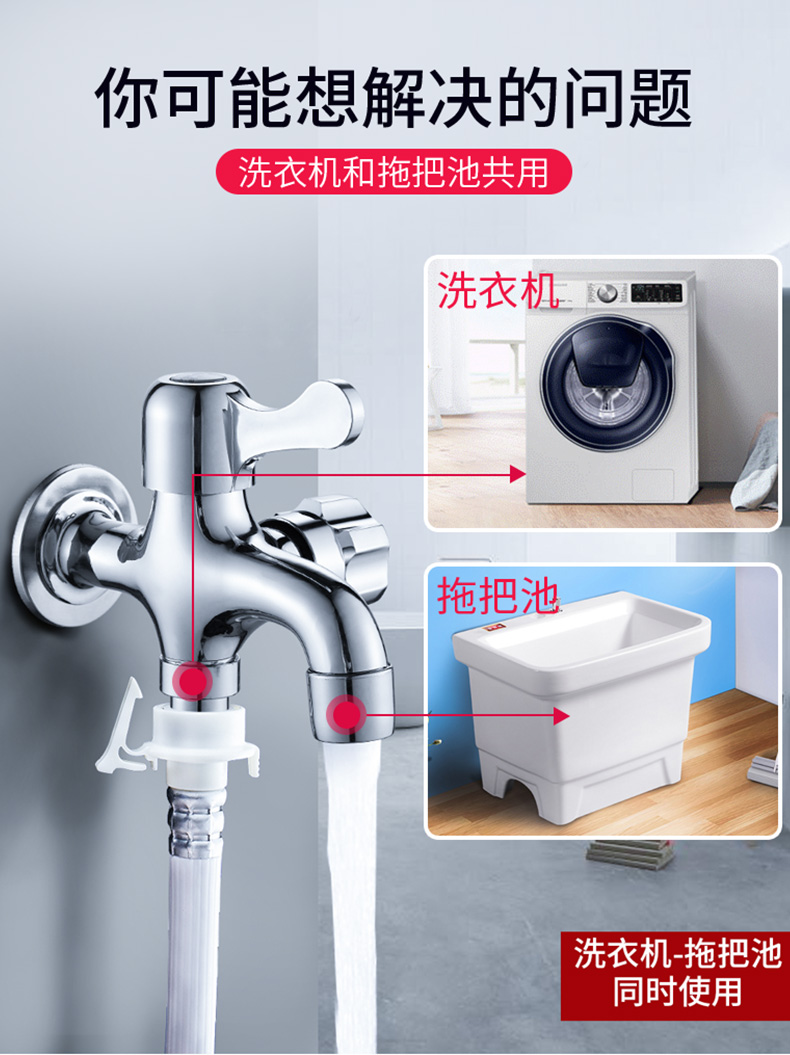 专利产品,黄铜主体,匠心品质,多功能双用,可独立控制,能同时出水,接拖把池、淋浴头,洗衣机等均可,加厚抗压防爆,优质过滤网,出水柔和不飞溅【三年质保】